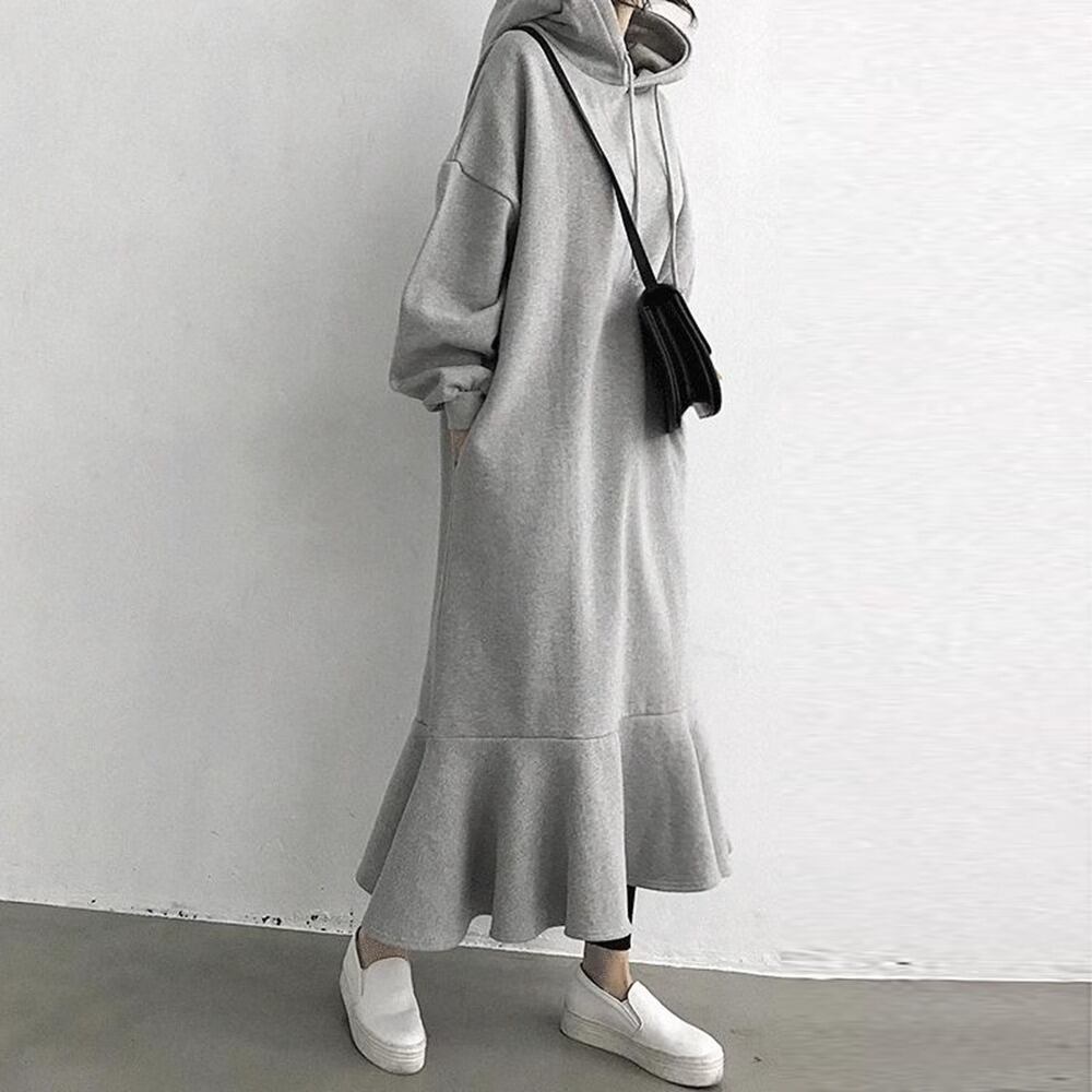 レディース ワンピース 膝下 ロング 長袖 フード フレア Aライン かわいい 大人可愛い きれいめ シンプル カジュアル 上品 おしゃれ かっこいい こなれ感 ラフ メンズライク スポーティー ルーズ クール 抜け感 アクティブ ナチュラル 可愛い 無地 秋 冬 ママ マタニティ デート お出かけ 旅行 公園 休日 ショッピング 韓国 コーデ 楽ちん 暖かい 体型カバー 普段使い モテ 清楚 スタイルアップ あったか ゆったり ゆる フリーサイズ 黒 ブラック グレー ベーシックカラー 大人カラー