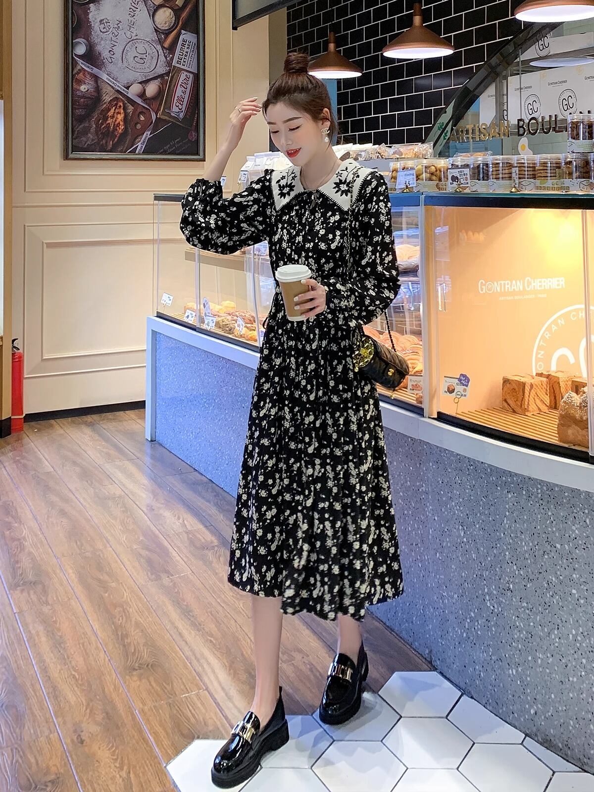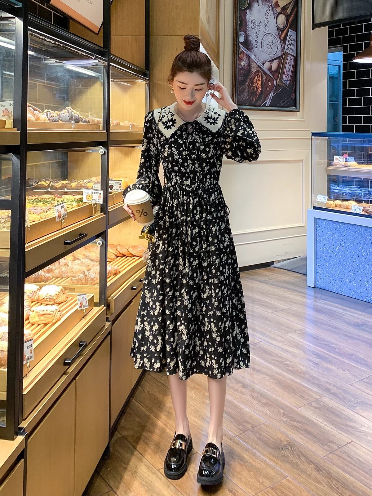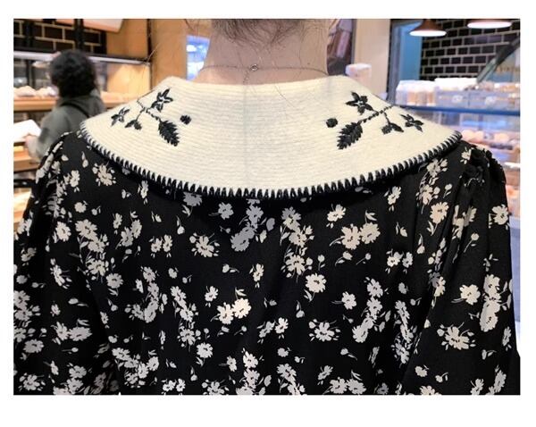 レディース ワンピース 膝下 ロング 長袖 襟付き 角襟 セミフレア スリム 細身 Aライン 刺繍 ウエストマーク ハイウエスト かわいい 大人可愛い きれいめ シンプル カジュアル 上品 おしゃれ レトロ こなれ感 ラフ ガーリー ルーズ エレガント とろみ感 ロマンティック ナチュラル 可愛い 花柄 春 秋 デート お出かけ 旅行 公園 休日 バカンス ショッピング コーデ 楽ちん 体型カバー 美脚 脚長 普段使い モテ 清楚 スタイルアップ S M L 黒 ブラック ベーシックカラー 大人カラー