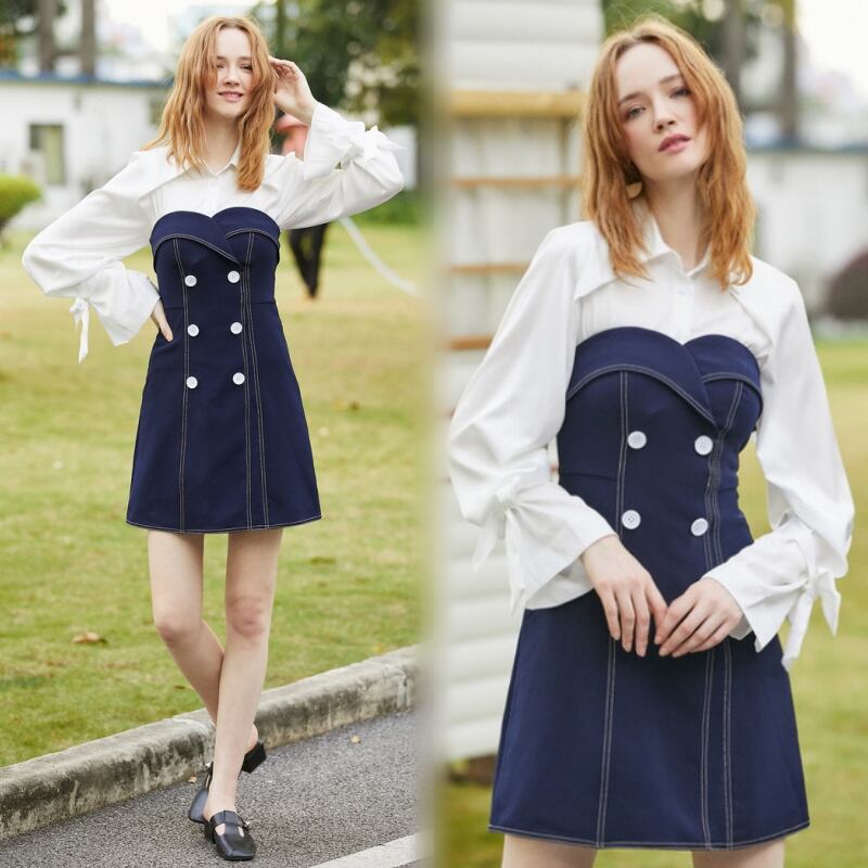 レディース スカート トップス ベアトップワンピース シャツ ブラウス セットアップ ツーピース ミニ ショート 長袖 襟付き 角襟 スリムフィット Aライン リボン バイカラー ダブルブレスト かわいい きれいめ シンプル 上品 おしゃれ レトロ ガーリー エレガント ラブリー キュート カジュアルロリータ クラシカル プレッピー ロマンティック シック 爽やか ドーリー 可愛い ドレッシー クリーン リュクス 無地 春 秋 デート お出かけ 普段使い 清楚 トレンド S ホワイト ネイビー