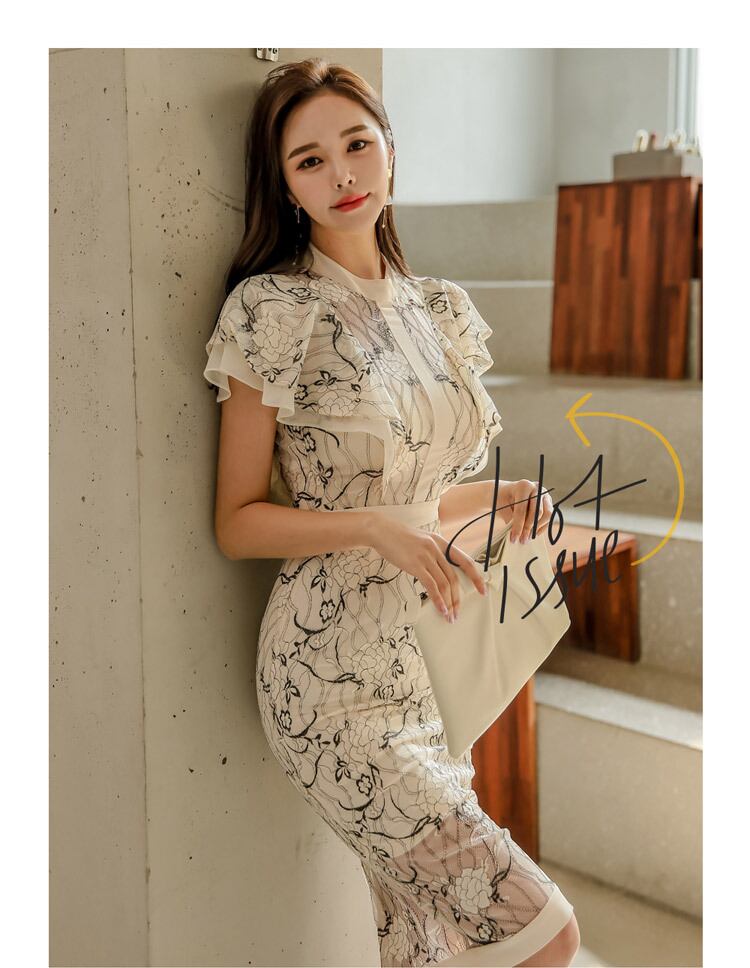 レディース ドレス ワンピース 膝丈 半袖 フレアスリーブ スタンドカラー スレンダー タイト スリム 細身 カクテル レース ウエストマーク スリット ハイウエスト 透け感 シースルー シアー 薄手 可愛い きれいめ 大人可愛い 上品 おしゃれ エキゾチック エレガント モダン 抜け感 ゴージャス セクシー シック 華やか センシュアル 花柄 フラワー 脚長 春 夏 披露宴 パーティー 謝恩会 キャバ ラウンジ クラブ S M L XL オフホワイト