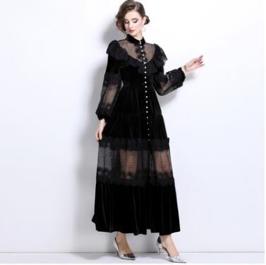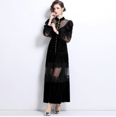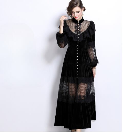 レディース ワンピース ドレス ミモレ ロング 長袖 ボリューム袖 バルーン袖 スタンドカラー セミフレア 切り替え ドッキング Xライン プリーツ レース フリル ハイウエスト 透け感 異国風 ギャザー 切り替えデザイン メッシュ 異素材ミックス パール 大人可愛い レトロ 主役級 存在感 クラシカル ロマンティック セクシー ドレッシー 無地 春 夏 お呼ばれ デート お出かけ レストラン 休日 体型カバー 美脚 脚長 肌見せ 涼しい M L XL 2XL 大きいサイズ 黒