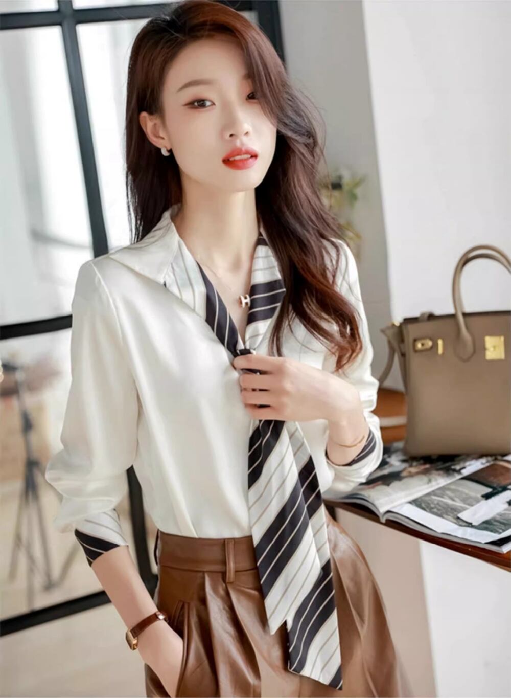 洗練と華やぎが共存する、ネクタイ付きホワイトブラウス。柔らかなサテン素材が生むとろみ感が、センシュアルな魅力を引き立てるVネック&角襟デザイン。モノトーンのストライプネクタイがプレッピーに映え、都会的な抜け感も演出。春から秋まで長く愛せる、OLさんのオフィススタイルにも、お出かけにも映えるエフォートレスな一枚です。