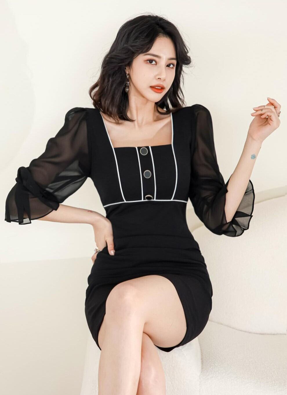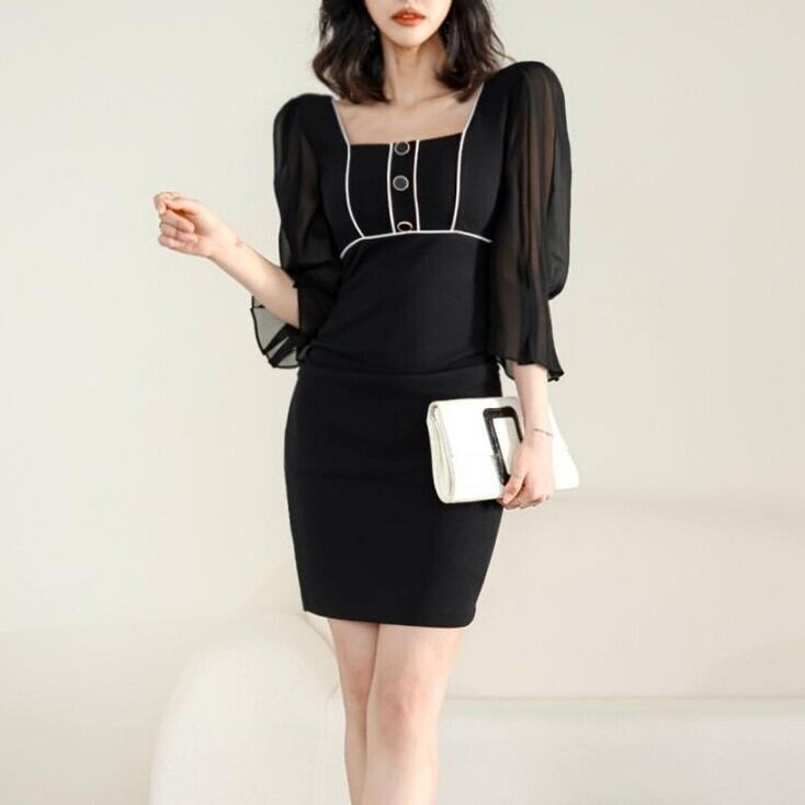 レディース ワンピース ミニ 膝上 ミディ ミドル 7分袖 ボリューム袖 パフスリーブ スクエアネック 襟なし タイト スリム 細身 フェミニン ボディコンシャス ハイウエスト 透け感 コンサバ 切り替えデザイン バイカラー 配色 飾りボタン シアー 大人可愛い きれいめ シンプル 上品 おしゃれ こなれ感 エレガント 存在感 抜け感 都会的 セクシー 色気 センシュアル 無地 春 夏 誕生日 お呼ばれ デート お出かけ レストラン 休日 ホテル 脚長 モテ インスタ映え S M L XL 黒 ブラック
