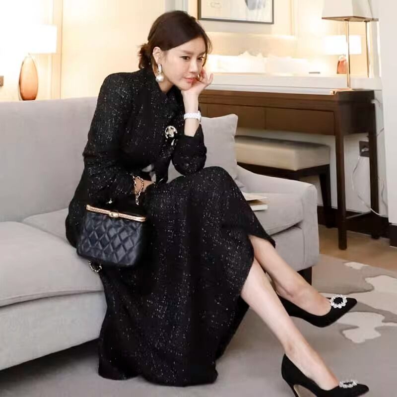 大人可愛い印象を与える、スーツセットアップです。秋冬にぴったりなロング丈のフレアスカートと長袖ジャケットの組み合わせは、エレガントでありながらもカジュアル感を演出します。前開きのボタンデザインとタックが施されており、シンプルでありながら存在感のあるアイテムです。無地の黒カラーは、ビジネスシーンからイベント、ホテルでのフォーマルな場面にも最適です。