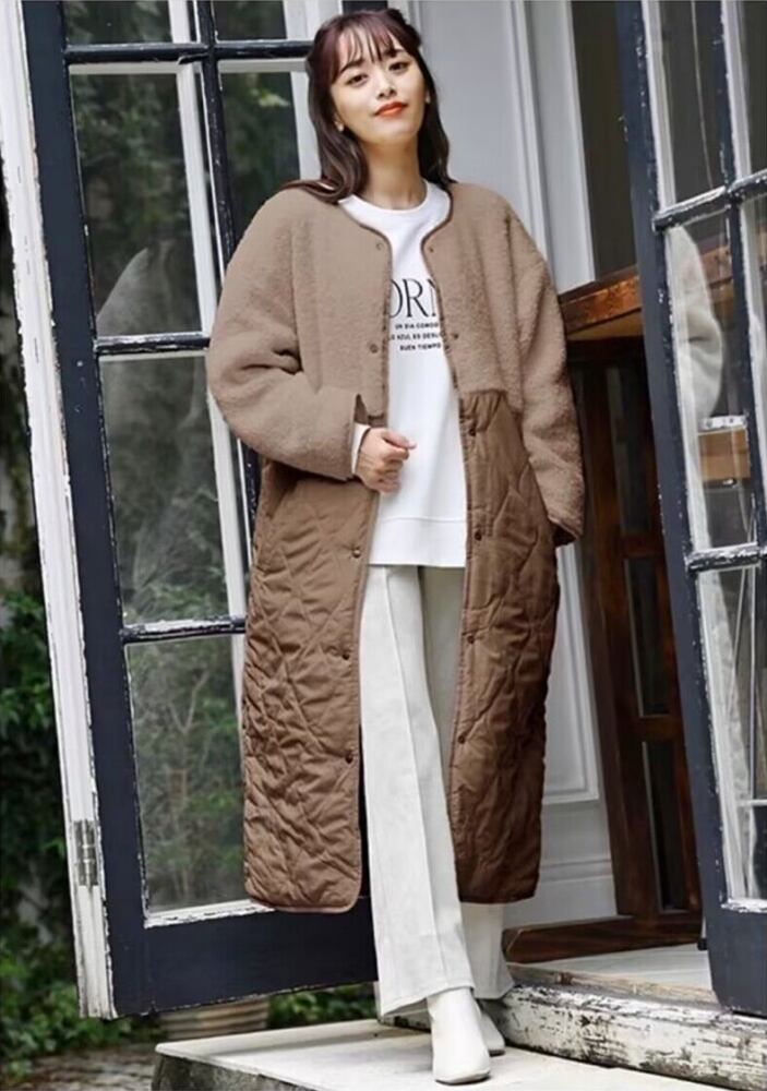 レディース コート アウター 防寒着 ロングコート キルティングコート ミモレ ロング 長袖 ラウンドネック Iライン ポケット 前開き ボタン 切り替えデザイン リバーシブル ボア 中綿 かわいい 大人可愛い きれいめ シンプル カジュアル おしゃれ こなれ感 ラフ モダン 抜け感 都会的 ベーシック アクティブ ナチュラル シック クリーン エフォートレス 無地 秋 冬 ママ お出かけ 休日 楽ちん 暖かい 普段使い 清楚 トレンド 定番 あったか リラックス L ゆったり ブラウン アイボリー