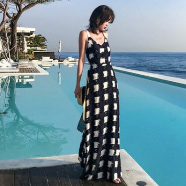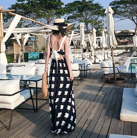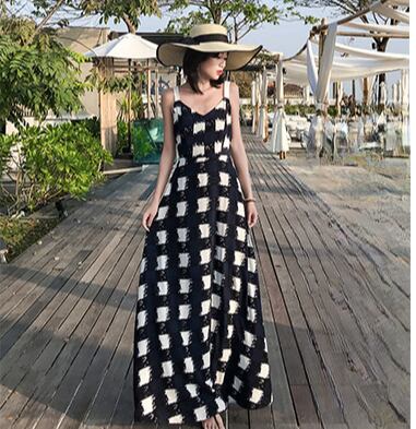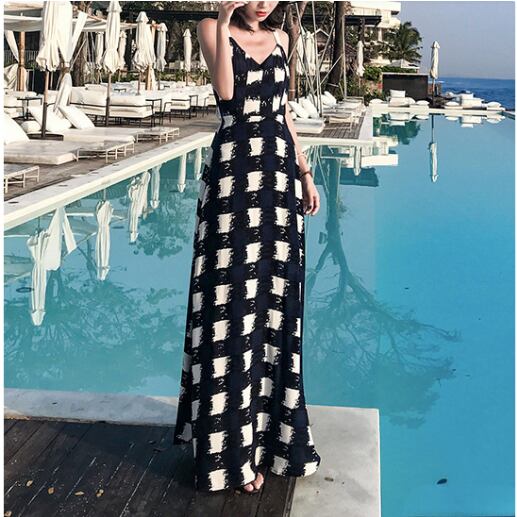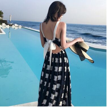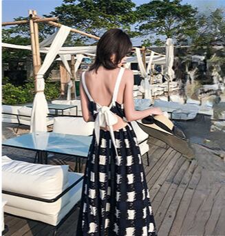 レディース ワンピース ドレス ロング マキシ 丈長 袖なし ノースリーブ Vネック ショルダーストラップ セミフレア Aライン 切り替え 背中開き フェミニン フィット&フレア ベアバック オープンバック リボン ウエストマーク バックリボン ハイウエスト ウエストゴム かわいい 大人可愛い カジュアル おしゃれ こなれ感 ラフ キュート ナチュラル セクシー 爽やか 可愛い 格子柄 夏 リゾート 旅行 海 モノトーン 楽ちん 脚長 肌見せ リラックス S M L XL 白 黒