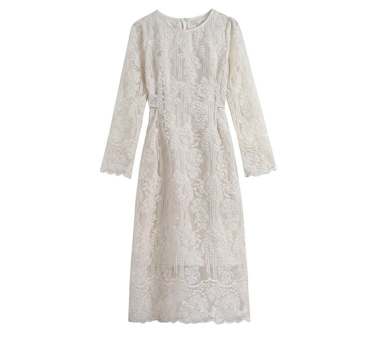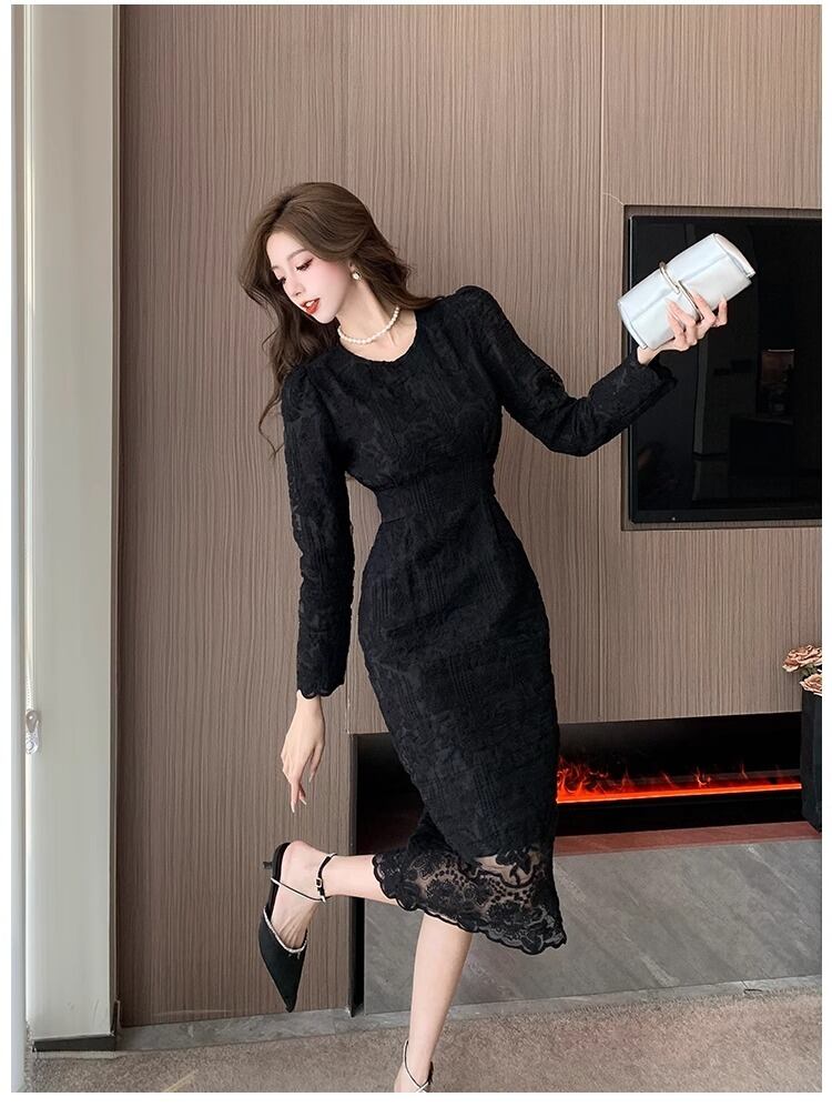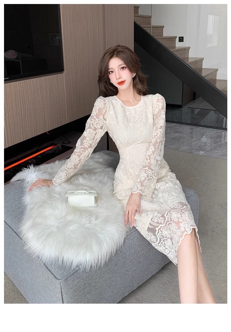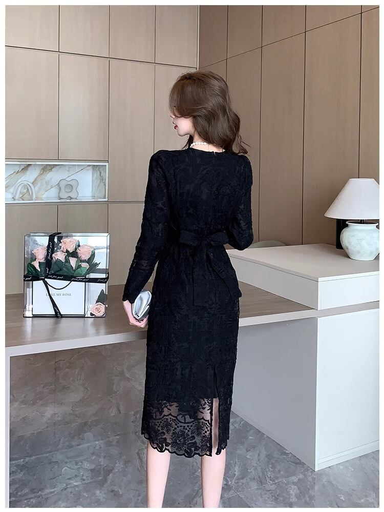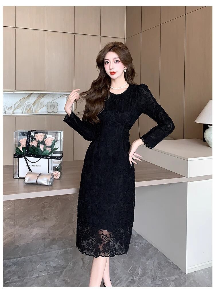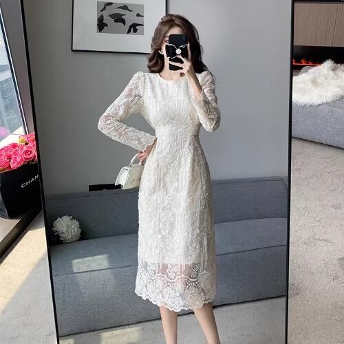 レディース ワンピース ドレス 膝下 ミモレ 長袖 ラウンドネック タイト スリム 細身 レース ウエストマーク バックリボン バックスリット 透け感 かわいい 大人可愛い きれいめ シンプル 上品 おしゃれ かっこいい エレガント フラワー 春 秋 デート お出かけ パーティー イベント レストラン ホテル ショッピング 発表会 コンサート コーデ 楽ちん 美脚 脚長 普段使い モテ 清楚 スタイルアップ S M L XL 2XL アプリコット ブラック ベーシックカラー 大人カラー 春カラー 秋カラー