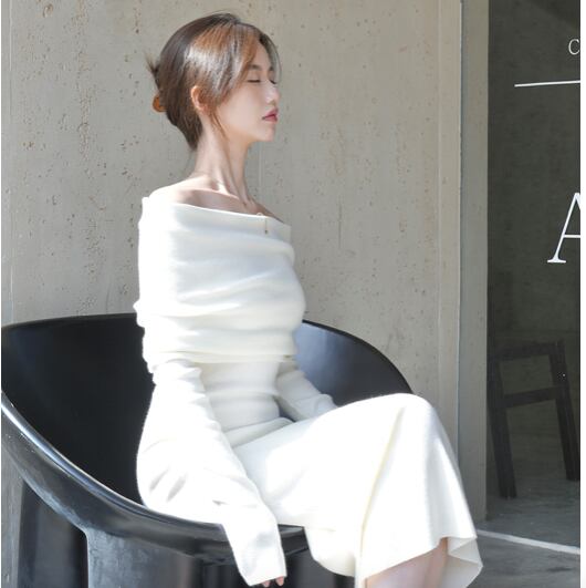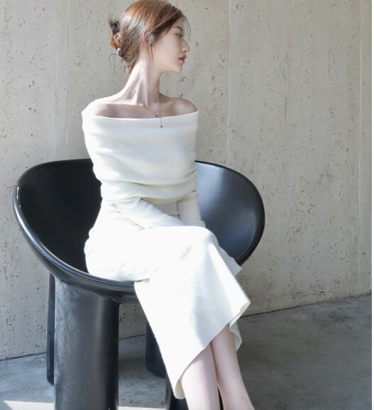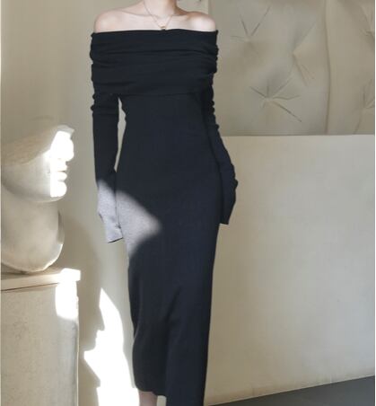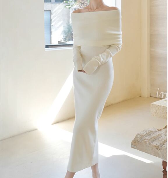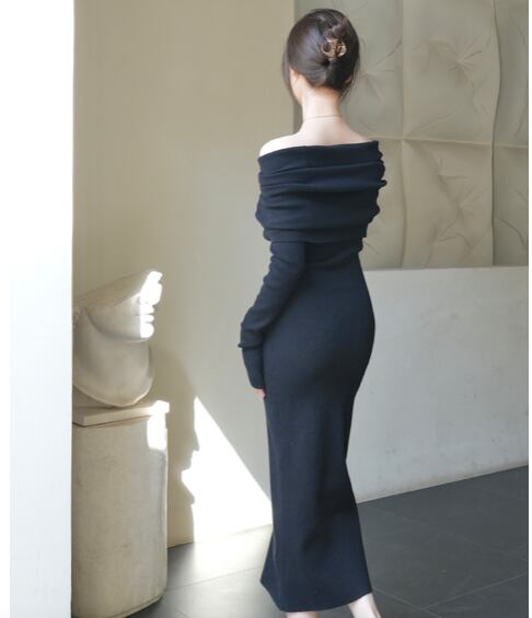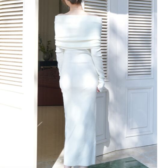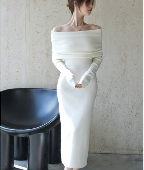 レディース ワンピース ドレス 膝下 ミモレ ロング クロップド丈 ミディ 長袖 lオングスリーブ オフショルダー タイト 背中開き ボディコンシャス タック バックコンシャス ハイウエスト リブ 伸縮性 大人可愛い きれいめ シンプル おしゃれ こなれ感 ラフ 抜け感 ナチュラル セクシー 色気 中華風 無地 秋 冬 クリスマス バレンタイン お呼ばれ デート お出かけ レストラン 女子会 休日 ショッピング カフェ スタイルアップ 肌見せ フリーサイズ 白 黒