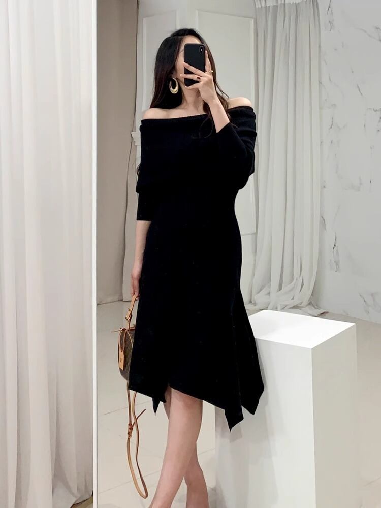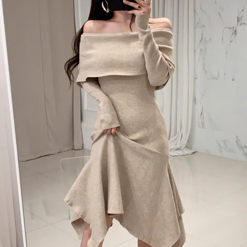 レディース ワンピース ドレス ニットワンピ 膝丈 ミモレ オフショルダー アシンメトリー フレア Aライン 伸縮性 大人可愛い きれいめ シンプル カジュアル 上品 おしゃれ こなれ感 ラフ ルーズ クール ナチュラル セクシー 色気 清潔感 無地 冬 ママ マタニティ デート お出かけ パーティー イベント レストラン 休日 ショッピング 発表会 韓国 コーデ 楽ちん 美脚 脚長 普段使い モテ 清楚 スタイルアップ S M L XL 黒 ブラック アプリコット ベーシックカラー 大人カラー