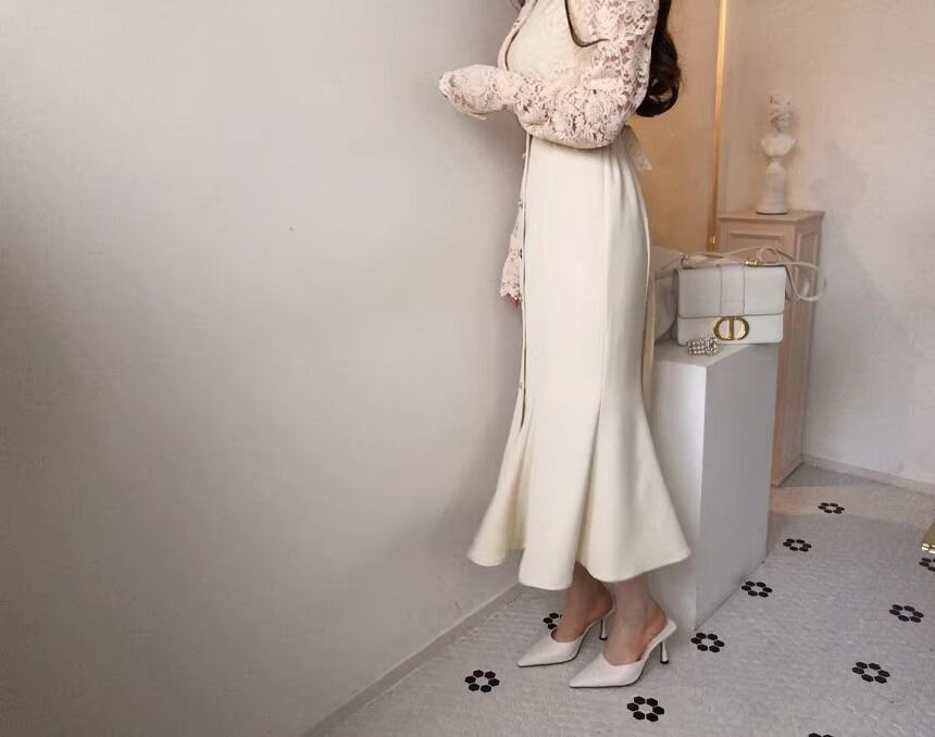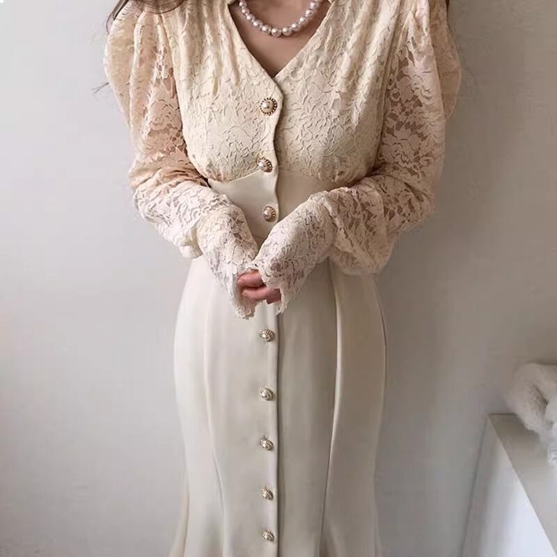 レディース ワンピース ロング 長袖 パフスリーブ Vネック セミフレア タイト スリム 細身 マーメイド タック レース 刺繍 ウエストマーク バックリボン 透け感 ボタン 切り替えデザイン 大人可愛い きれいめ シンプル カジュアル 上品 おしゃれ かっこいい こなれ感 エレガント 無地 春 秋 デート お出かけ パーティー イベント レストラン ホテル 発表会 コンサート コーデ 楽ちん 脚長 普段使い モテ 清楚 スタイルアップ S M L ブラック アプリコット ベーシックカラー 大人カラー