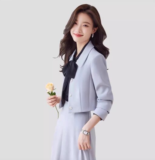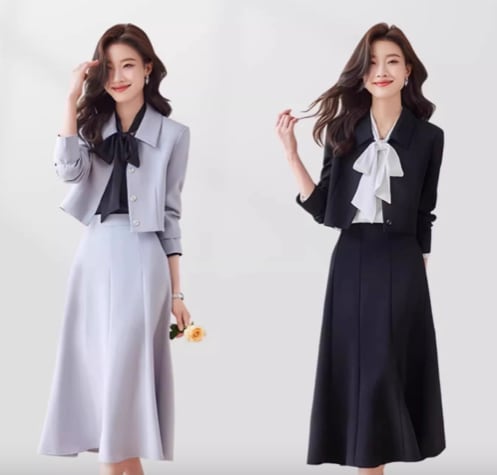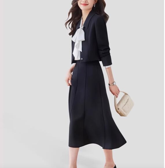 フレアスカートとジャケットの組み合わせは、華やかさとスタイリッシュさを兼ね備え、会議やプレゼン、オフィスでの存在感を引き立てます。