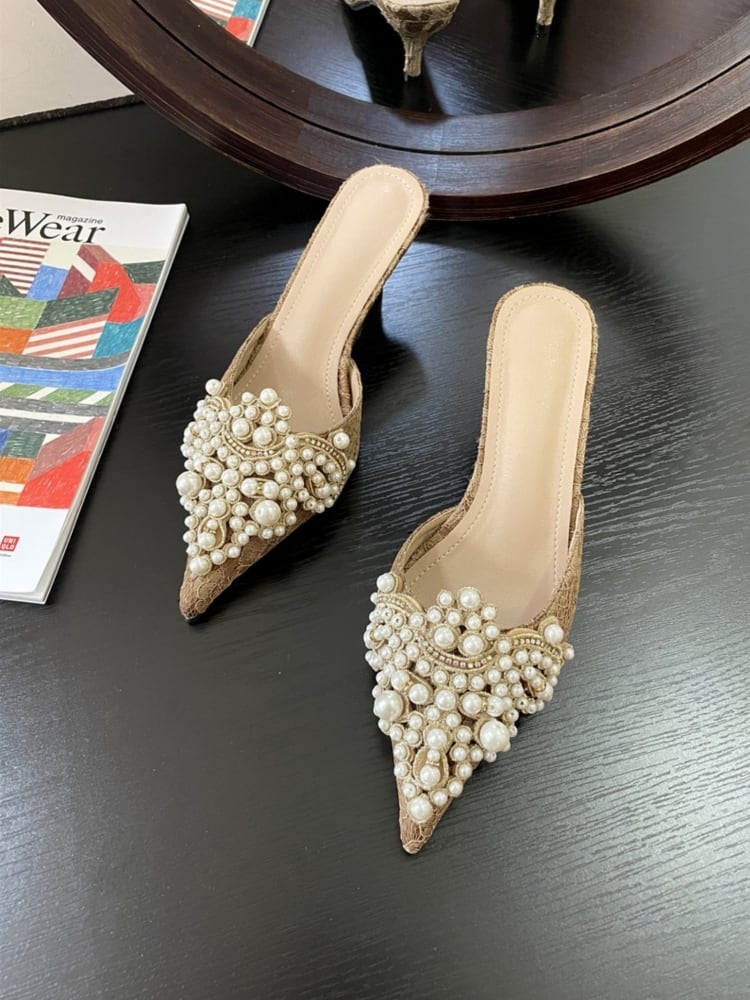 レディース ミュール ミドルヒール 6cm スプールヒール ポインテッドトゥ レース パール 大人可愛い きれいめ 上品 おしゃれ かっこいい エレガント セクシー 主役級 存在感 抜け感 エキゾチック 華やか フェミニン 色気 ゴージャス ラグジュアリー センシュアル リュクス 春 夏 謝恩会 結婚式 披露宴 パーティー ホテル 高見え 格上げ 22.5cm 23.0cm 23.5cm 24.0cm 24.5cm 25.0cm 大きい 大きめ ブラック アプリコット ライトブラウン