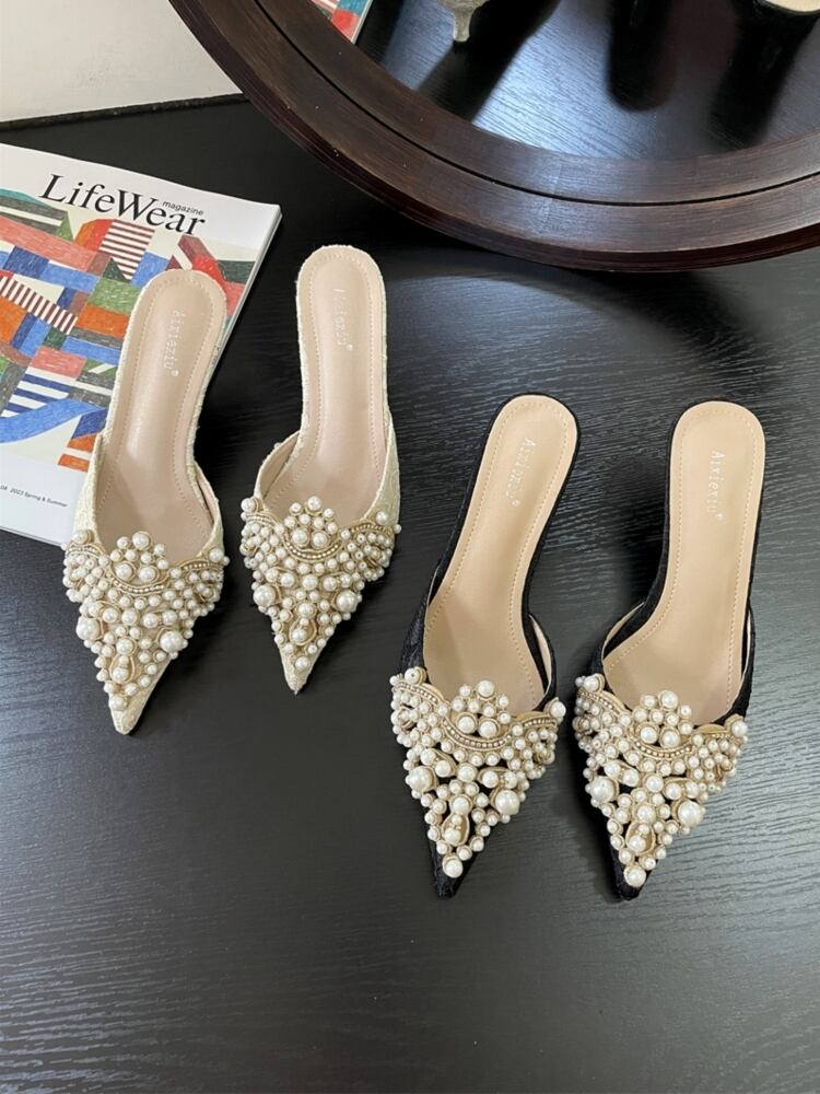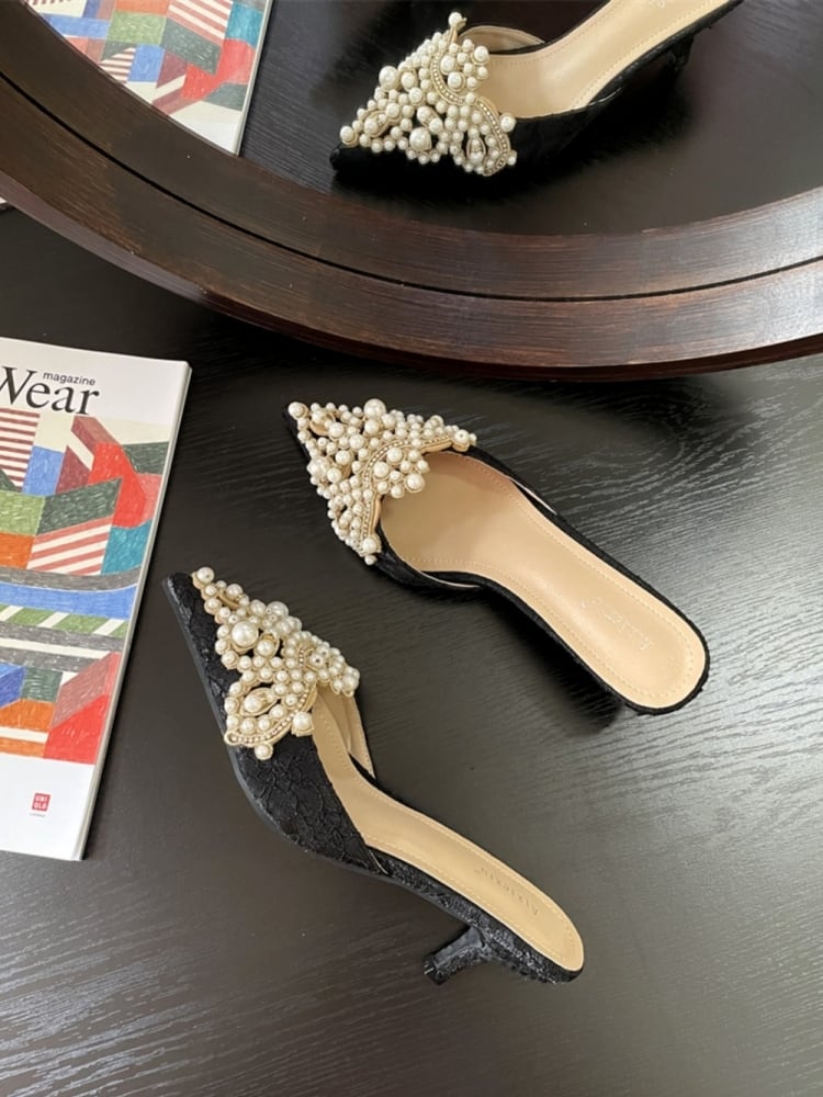 格上げスタイルを叶える主役級ミュールです。繊細なレースにたっぷりのパールがちりばめられた、圧倒的存在感の一足。6cmミドルヒールで美脚をキープしつつ、歩きやすさも◎。ポインテッドトゥが足元をシャープに演出し、春夏のパーティーコーデを一瞬でラグジュアリーに昇華。ブラック/アプリコット/ライトブラウンの3色展開、22.5cm〜25.0cmの大きめサイズまで揃っていて、どんな足元も華やかに彩ります。