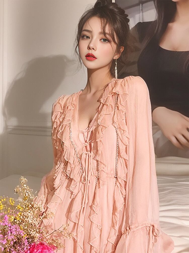 大人可愛いスタイルを演出する、レディースミニワンピースです!たっぷりのボリュームフリルがフェミニンさを引き立てるシフォン素材は、膝上のミニ丈と透け感ある雰囲気で上品さとセクシーさを両立させています。シンプルでありながら個性的なデザインは、カジュアルからパーティーシーンまで幅広く活躍。デートやお出かけ、女子会など、多彩なシーンで主役級の存在感を発揮します。