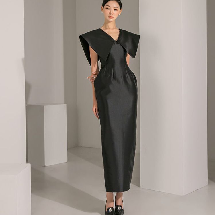 大人の女性にぴったりな、エレガントなラージカラードレスです!シックなペンシルスカートと膝下のミモレ丈が魅力的なデザインで、パーティーや二次会、披露宴、演奏会といった特別なシーンにぴったりです。大胆なVネックとハイウエストのタックが、スタイルを美しく引き立て、抜け感のあるシルエットを演出します。