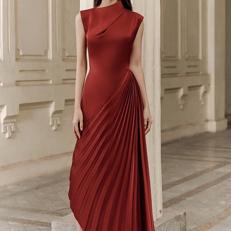 大人可愛いスタイルを演出する、特別なシーンにぴったりなレッドのミモレ丈ドレスです!襟元のイレギュラーなドレープ感が特徴的で、アシンメトリーなプリーツスカートがモードな印象を与えます。フォーマルなパーティーや二次会、披露宴、演奏会など、主役級の存在感を発揮する一着です。