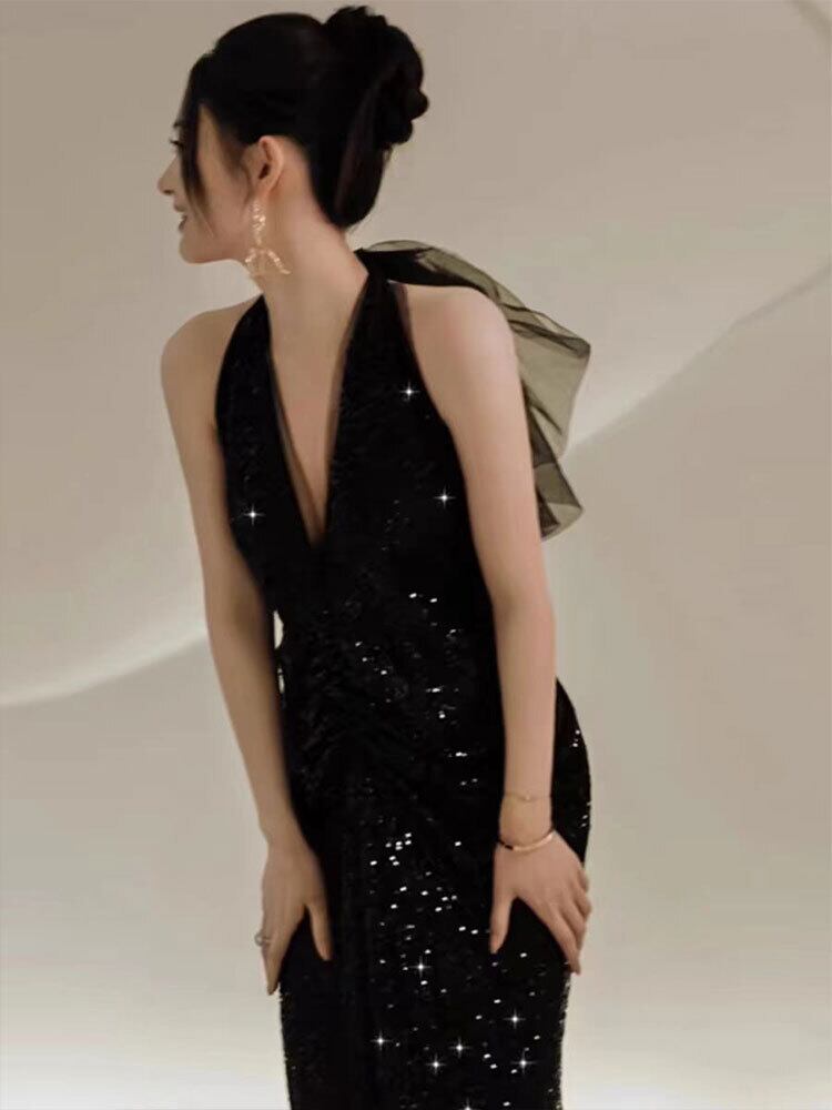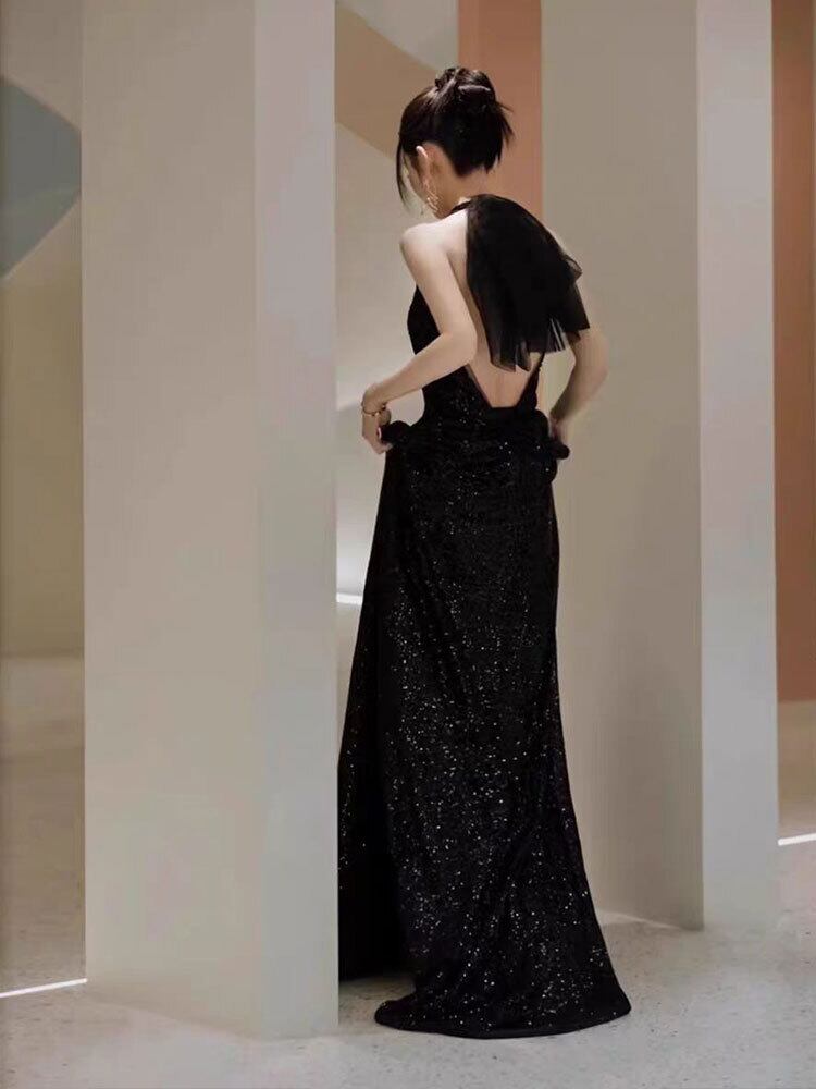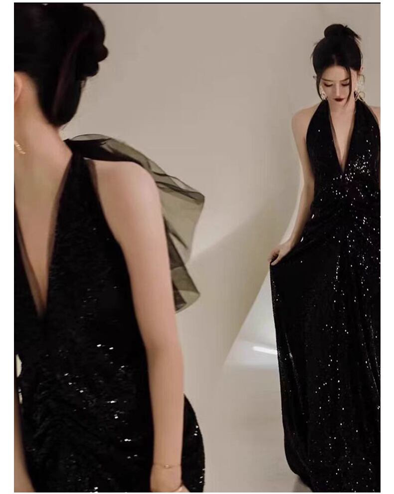 華やかなスパンコールが輝く、特別なシーンにぴったりなレディース ブラックドレスです!スッキリとしたホルターネックとエレガントなマキシ丈が魅力を引き立て、フォーマルなパーティーや二次会、披露宴、演奏会など、主役級の存在感を放ちます。シンプルながらも洗練されたAラインのシルエットが、大人可愛い印象を与え、美脚効果も期待できます。