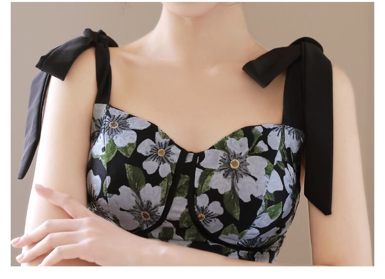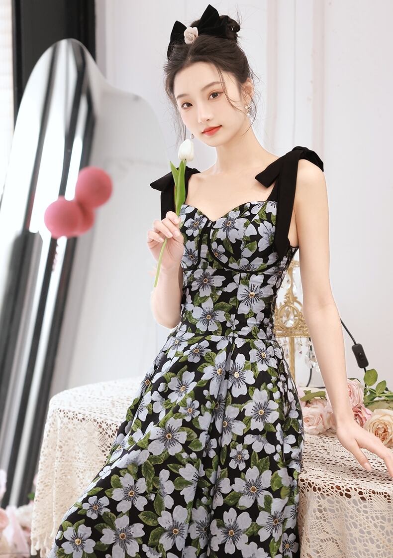 大人可愛いスタイルを演出する、特別なシーンにぴったりなレディース ワンピースです!膝下のミモレ丈と袖なしデザインが魅力的で、フレア Aラインが優雅なシルエットを演出します。バスト周りのシックなコルセットデザインに、可愛らしいリボンストラップがガーリーさをプラス。大花柄が目を引くこのワンピースは、春や夏のデート、お出かけに最適です。