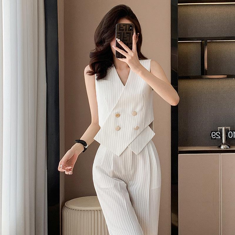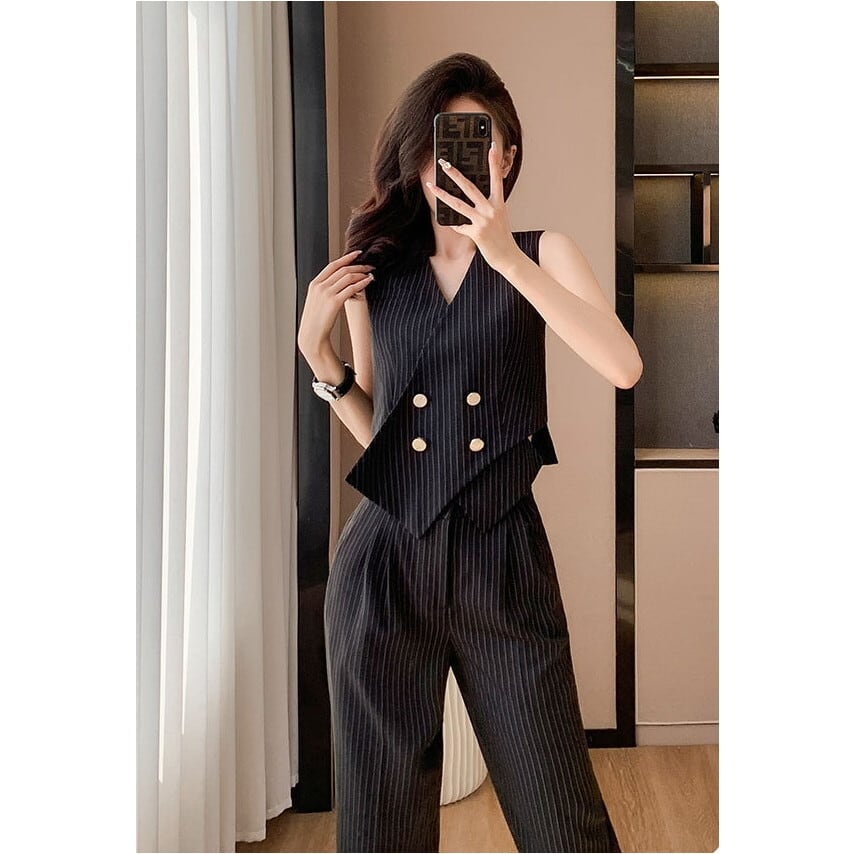 ストライプ柄が爽やかに映える、セットアップが登場です!金ボタンが施されたクラシカルで上品なデザインが、あなたの存在感を引き立たせます。袖なしのVネックが大人可愛い印象を与え、シンプルながらもおしゃれなルックスで、カジュアルなシーンからエレガントなシーンまで幅広く活躍します。
