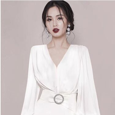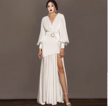 レディース ワンピース ドレス ロング マキシ 丈長 長袖 ボリューム袖 バルーン袖 Vネック 襟なし セミフレア アシンメトリー 切り替え ドッキング Xライン タック ベルト ウエストマーク サイドスリット ハイウエスト きれいめ 上品 おしゃれ モード系 エレガント モダン ラグジュアリー セクシー リュクス 無地 お呼ばれ パーティー イベント レストラン ホテル 体型カバー 美脚 脚長 スタイルアップ 高見え 格上げ S M L 白 ホワイト