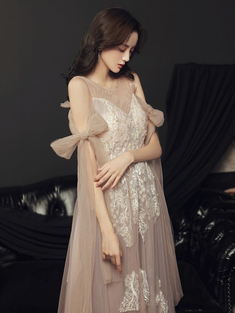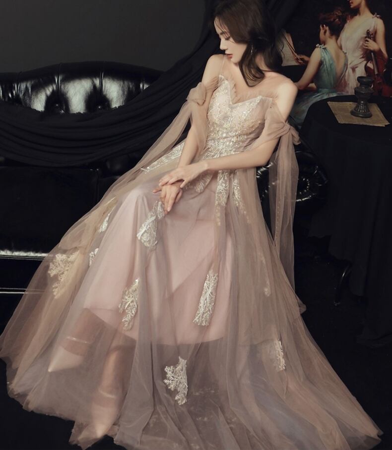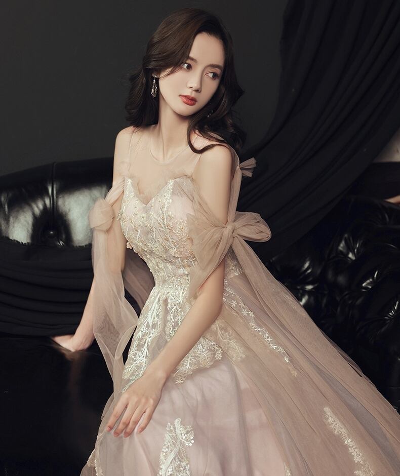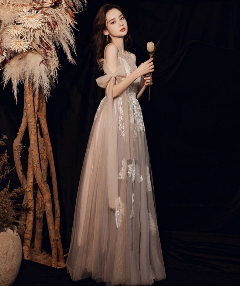 シャンパンカラーが魅せるロマンティックドレスです。花柄レースとフリルが繊細に揺れるAラインのフレアドレスは、華やかな披露宴やパーティーにふさわしい存在感。背面のレースアップとリボンが、可愛らしさと上品さを両立させ、二の腕も自然にカバーします。小さいサイズからプラスサイズまでXS〜3XLまで展開。シャンパンカラーの優美さで、あなたを映画のヒロインに。