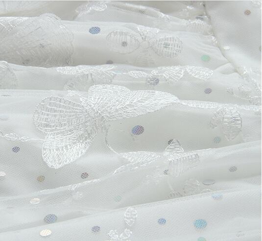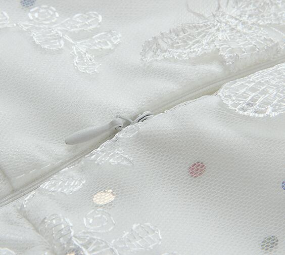 内側のドット柄生地に繊細な花柄と蝶の刺繍をあしらった透け生地を重ねた、ロマンティックなワンピース。