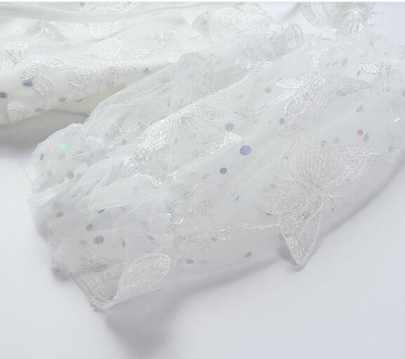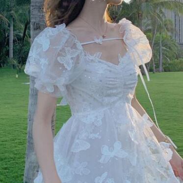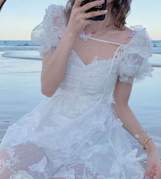 胸元のストラップや蝶のワンポイントが甘さを添えつつも、大人可愛い印象に仕上げてくれる軽やかな一着。お呼ばれやパーティー、誕生日のお出かけなど、特別な日に“主役級”の存在感を放つドレスです。ホワイトの清楚なカラーが夏の陽射しに映え、写真映えもばっちりです。
