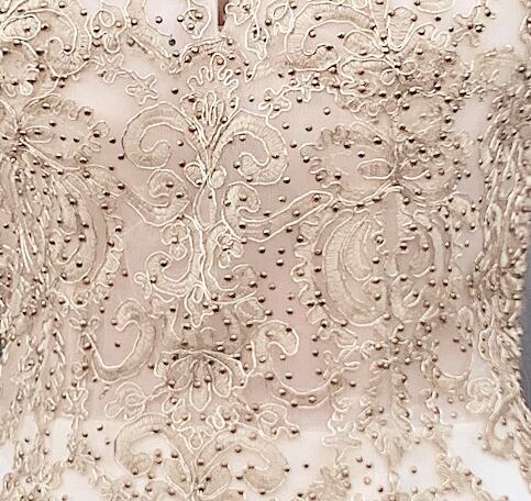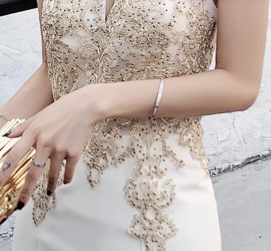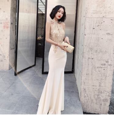 きらめくラメ感とボディラインを美しく魅せるマーメイドシルエットが印象的な、ラグジュアリーなロングドレス。