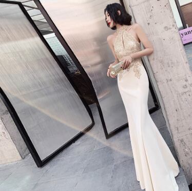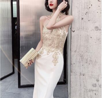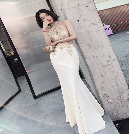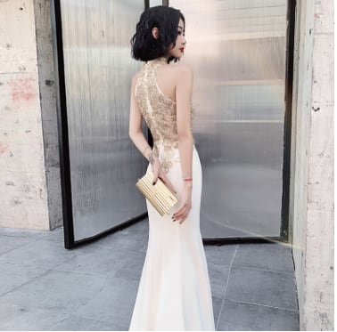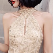 ホルターネック×キーネックの上品な肌見せに、オープンショルダーや背中開きのデザインが大胆さを添え、視線を惹きつける主役級の一着です。