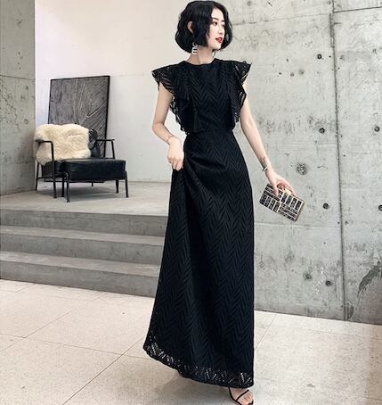 繊細なクロシェレースが全体を彩る、フェミニンなロングワンピース。