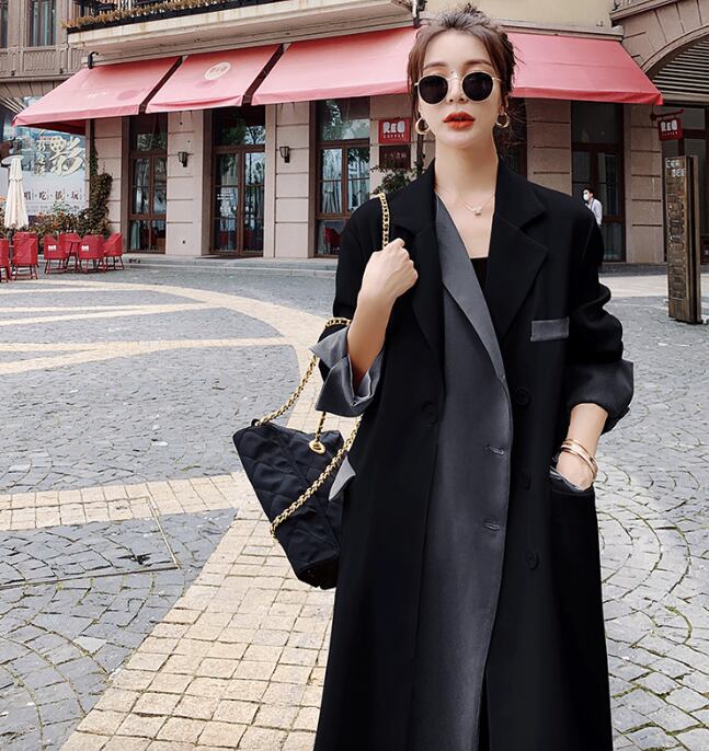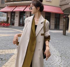 モードな雰囲気漂うバイカラーデザインが目を惹く、ミモレ丈のテーラードコート。