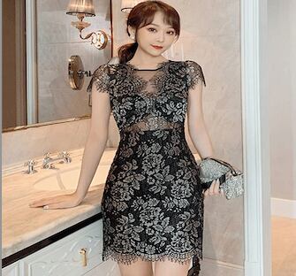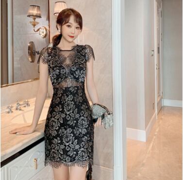 レディース ワンピース ドレス ミニ ショート 膝上 パフスリーブ レース袖 ラウンドネック 襟なし ノーカラー タイト Xライン レース 刺繍 ハイウエスト 切り替えデザイン 総レース 異素材ミックス シアー メッシュ シースルー きれいめ おしゃれ エレガント モダン 抜け感 ラグジュアリー セクシー 色気 華やか ドレッシー リュクス 花柄 ボタニカル 総柄 夏 お呼ばれ パーティー イベント ホテル クラブ キャバ ラウンジ 脚長 スタイルアップ 肌見せ S M L XL 黒 ブラック ゴールド