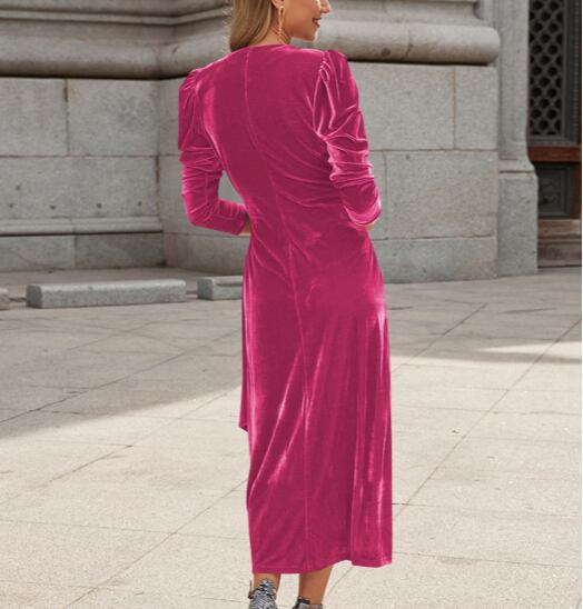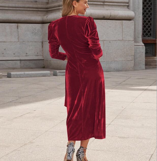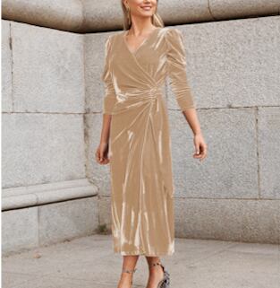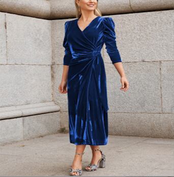レディース ワンピース ドレス ミモレ ミディ 7分袖 パフスリーブ Vネック カシュクール タイト ストレート ドレープ ウエストマーク ウエストリボン ハイウエスト きれいめ シンプル 上品 エレガント モダン 存在感 ラグジュアリー クラシカル 色気 シック ドレッシー 無地 春 秋 二次会 お呼ばれ お出かけ パーティー イベント レストラン ホテル S M L XL 黒 ブラック ベージュ ブルー レッド ダークグリーン ローズレッド サファイアブルー