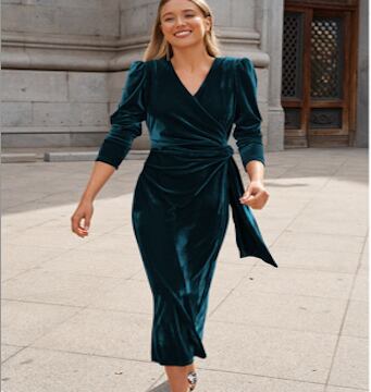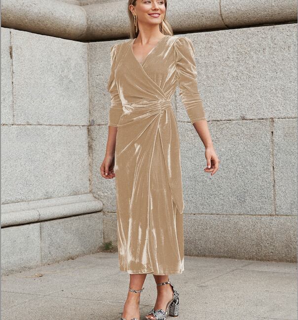 流れるようなドレープとカシュクールのVネックが、美しいデコルテラインを演出するミモレ丈ワンピース。