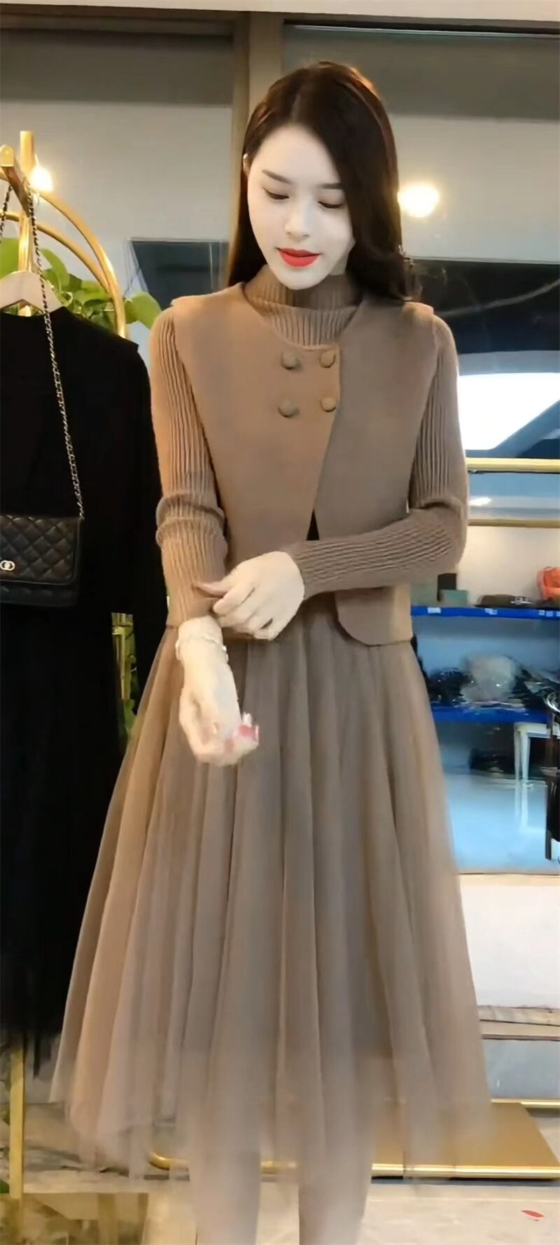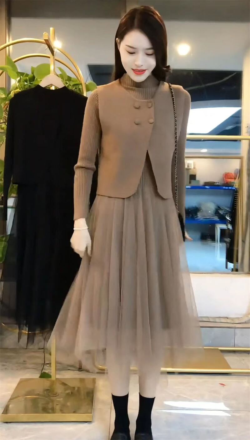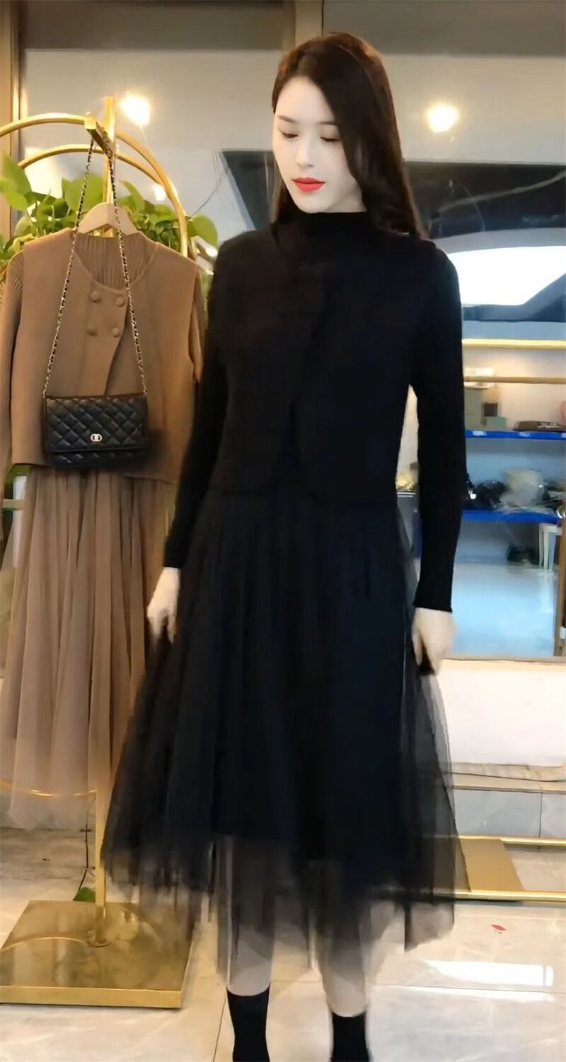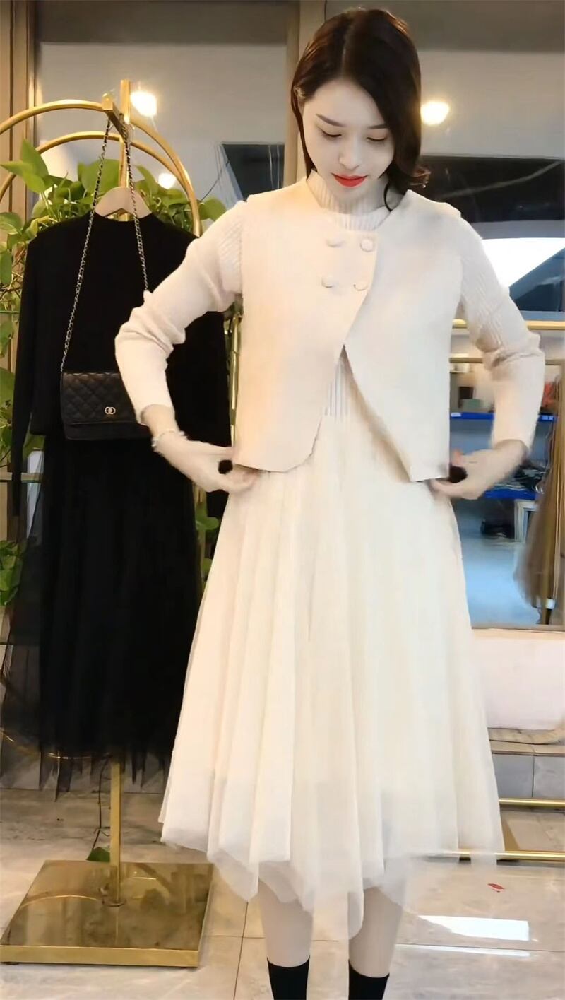 大人のきれいめカジュアルが楽しめるニットセットアップです。リブニットのフィット感が心地よく、スカート部分のチュールが動くたびにフェミニンな雰囲気を演出。ベストとの絶妙なセットアップで、清楚でエレガント、かつエフォートレスな印象に。春と秋の季節感に寄り添う、大人のための「かわいい」が詰まった一着です。