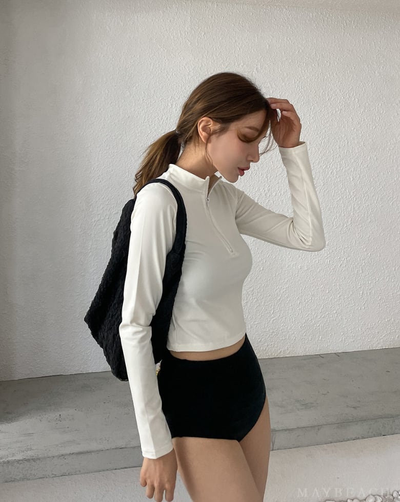 アクティブ女子に捧ぐ、ヘルシー&スポーティーなスリーピース水着。ナチュラルなホワイトの長袖ラッシュガードと、スタイルアップを叶えるハイウエストビキニで動きやすさも可愛さも両立。プールでも海でも、日除け対策はバッチリ。カジュアルで健康的な魅力を放つスイムウェアは、アクティブな夏を思い切り楽しみたいあなたにぴったり!