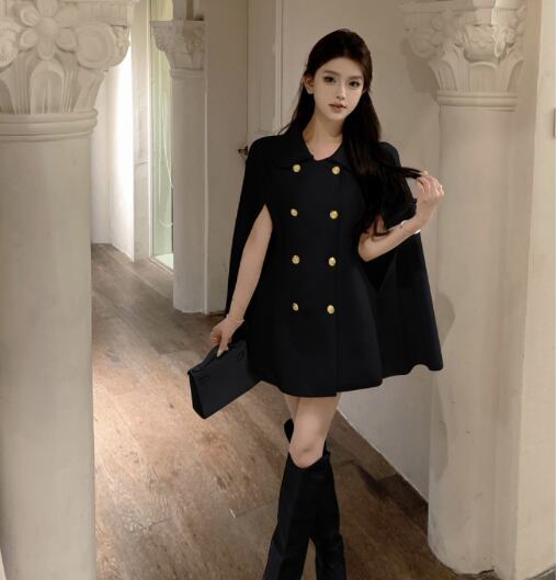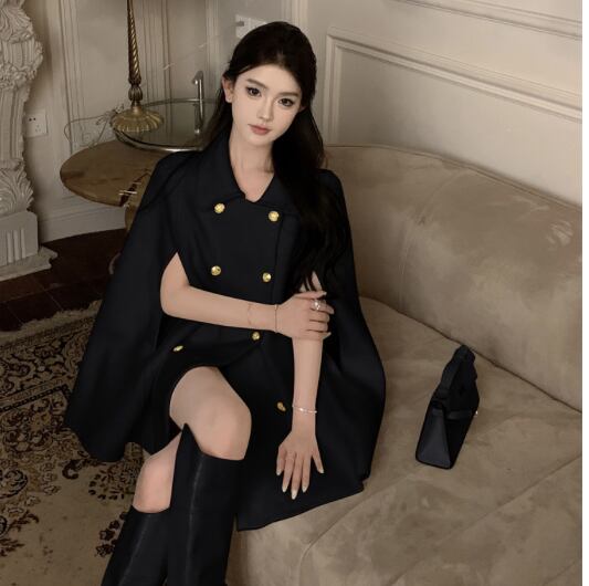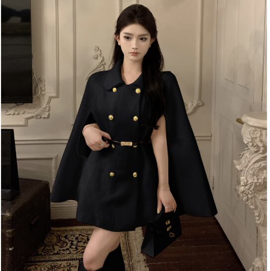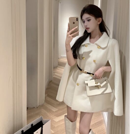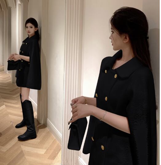 丸襟×ワイドなAラインシルエットが印象的な、フェミニンでクラシカルなケープ風コート。