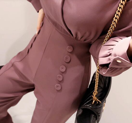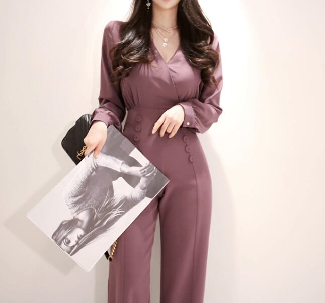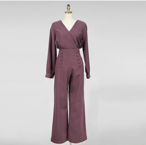 レディース オールインワン アンクル丈 長袖 カフスリーブ Vネック カシュクール 襟なし ノーカラー ワイド 切り替え プリーツ タック ウエストマーク ハイウエスト ボタン 切り替えデザイン 飾りボタン 大人可愛い きれいめ 上品 おしゃれ かっこいい レトロ こなれ感 クール モード系 エレガント モダン 主役級 存在感 ラグジュアリー クラシカル マスキュリン 無地 春 秋 お呼ばれ OL お出かけ レストラン ホテル ショッピング 体型カバー スタイルアップ S M L XL パープルレッド