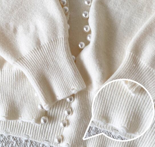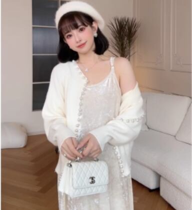 ほんのりラメ感のある素材に、パール調の飾りボタンが上品な輝きを添える、大人可愛いワンピース&カーディガンのセットアップ。