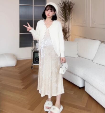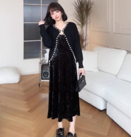 レディース ワンピース カーディガン セットアップ マタニティ 膝下 ミモレ ミディ ミドル 長袖 ラメ感 Vネック 襟なし ノーカラー セミフレア Iライン オーバーサイズ フェミニン 前開き ボタン 飾りボタン パール かわいい 大人可愛い おしゃれ キュート ロマンティック ナチュラル 可愛い 無地 秋 冬 ママ お出かけ 旅行 休日 ショッピング カフェ 重ね着 コーデ 楽ちん 体型カバー 普段使い 着回し M L XL ゆったり 黒 ブラック ベージュ 光沢