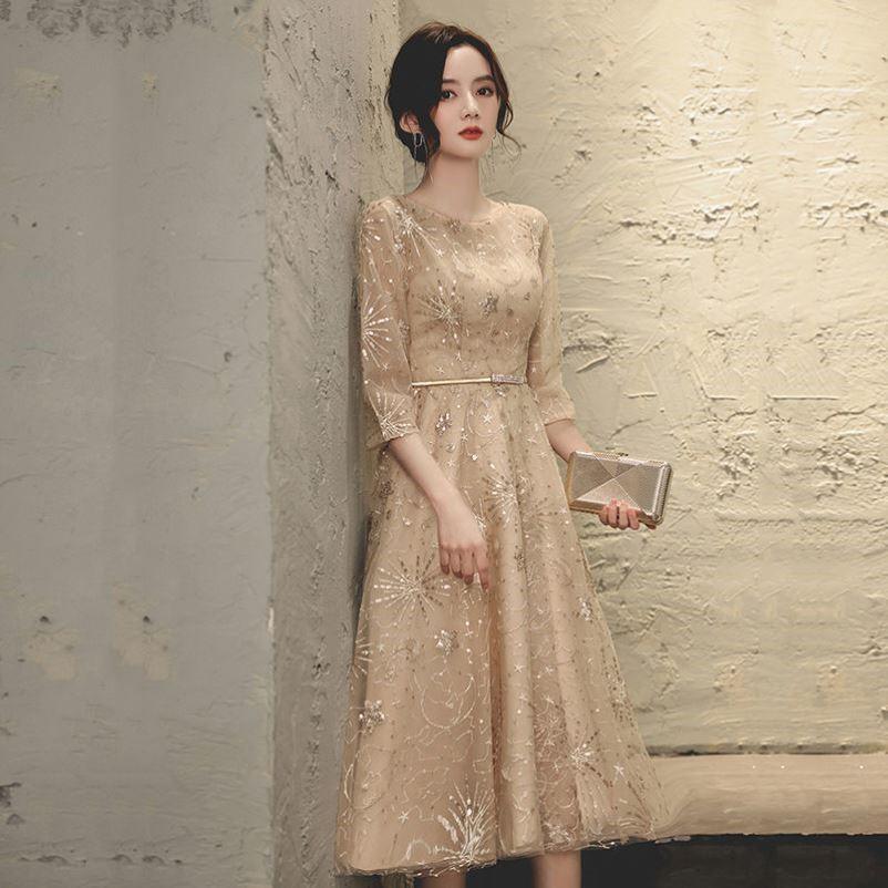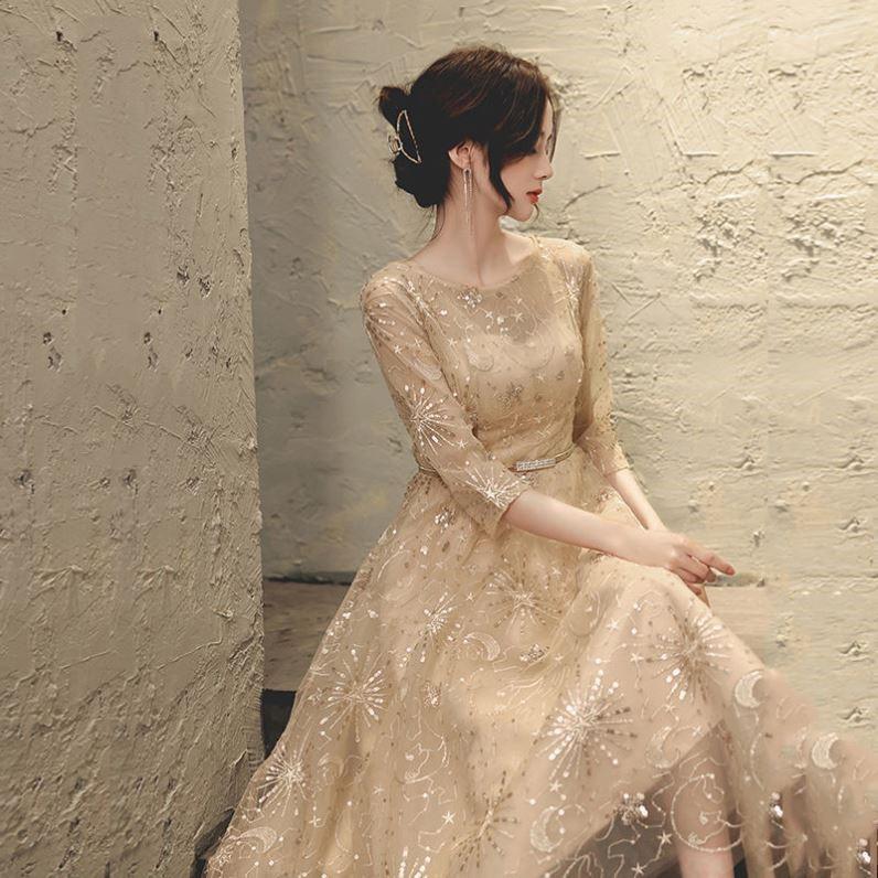 レディース ドレス ワンピース パーティー 結婚式 二次会 披露宴 演奏会 発表会 ステージ 謝恩会 ミモレ ミディアム丈 7分袖 ラウンドネック フレア Aライン カクテル イブニング 刺繍 ウエストマーク ハイウエスト 透け感 薄手 可愛い きれいめ 大人可愛い 上品 おしゃれ キュート ガーリー 抜け感 清楚 ゴージャス エレガント シック 華やか 爽やか リュクス ロマンティック 星 月 イベント ホテル レストラン 二の腕カバー スタイルアップ 春 夏 秋 S M L XL 2XL シャンパン