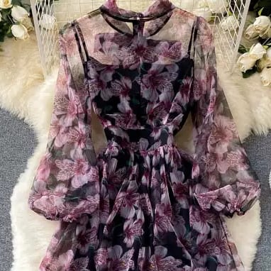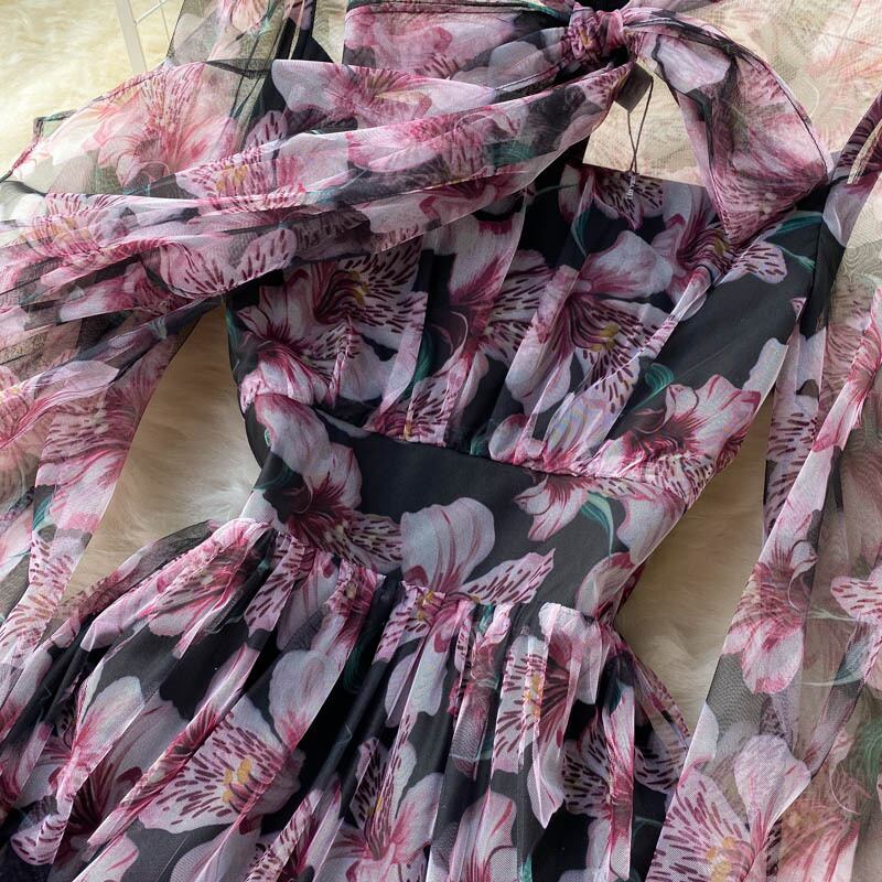 ワンピース フレア マキシ 長袖 ボリューム袖 Vネック りぼんタイ フレア Aライン リボン 透け感 シースルー かわいい 大人可愛い きれいめ 上品 おしゃれ こなれ感 エレガント ロマンティック 色気 華やか 清潔感 花柄 フラワー 春 夏 誕生日 お呼ばれ 20代 30代 40代 デート お出かけ イベント レストラン ホテル ショッピング カフェ 韓国 オルチャン 脚長 モテ 清楚 スタイルアップ 肌見せ S M L XL 2XL 大きいサイズ 黒 ブラック 紫 大人カラー パープル