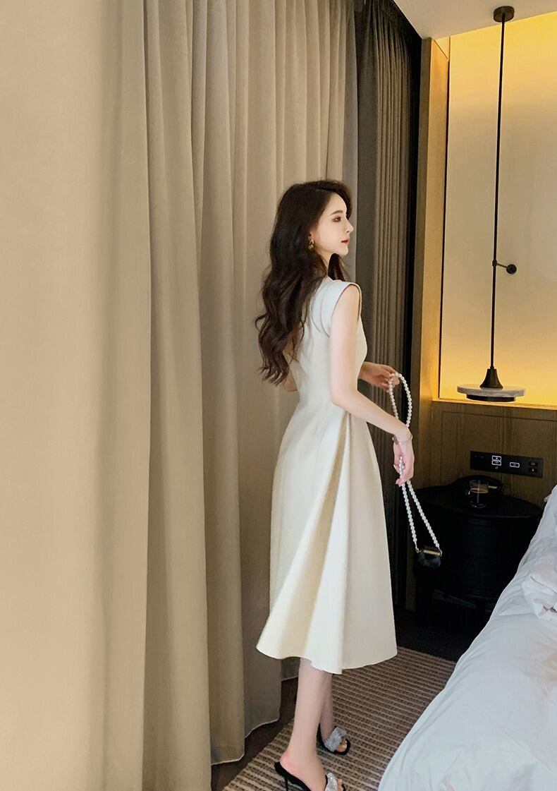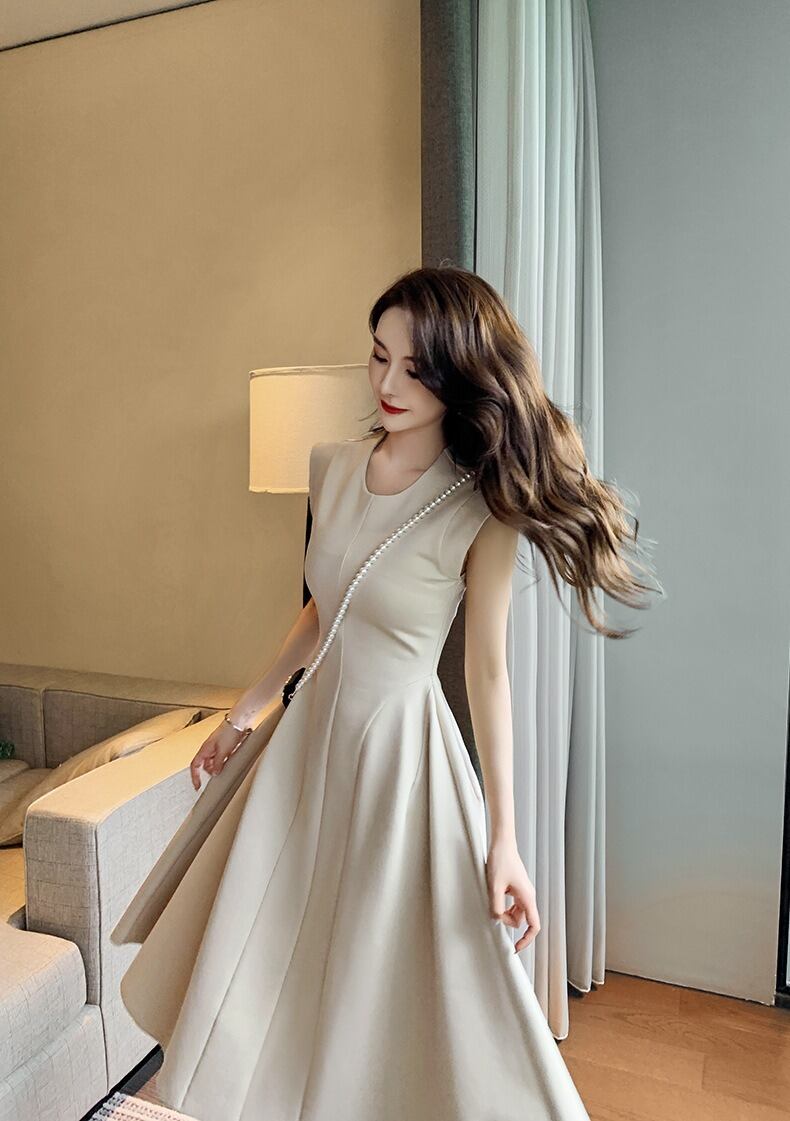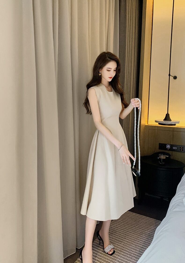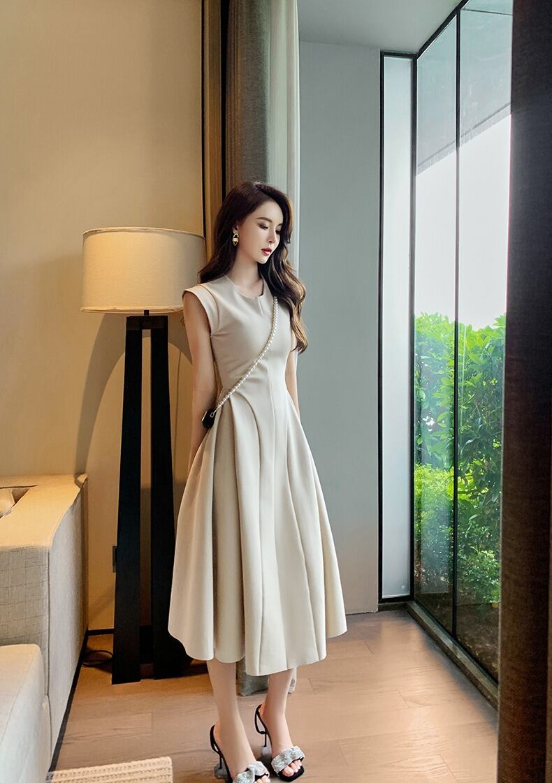 レディース ワンピース ミディ ノースリーブ クルーネック フレア Aライン ファスナー ハイウエスト かわいい 大人可愛い きれいめ シンプル カジュアル 上品 おしゃれ かっこいい こなれ感 ラフ クール モード系 エレガント ナチュラル 色気 無地 春 夏 デート パーティー イベント レストラン バカンス ショッピング 発表会 コンサート コーデ 楽ちん 体型カバー 美脚 脚長 普段使い 着回し モテ 清楚 スタイルアップ 涼しい 高見え S M L アプリコット ベーシックカラー 大人カラー