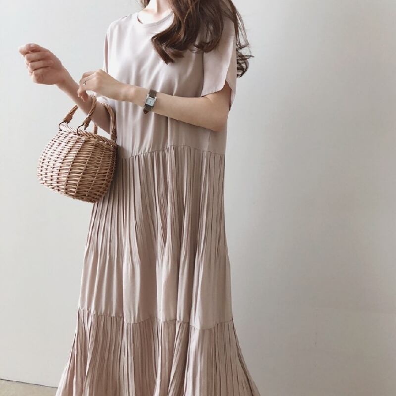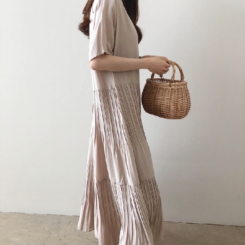 春夏の空気にぴったり寄り添う、無地でクリーンな印象のマキシワンピース。細かいプリーツが動くたびに表情を変え、ふんわり広がるAラインが「かわいい」と「こなれ感」を両立。5分袖でほどよい抜け感もあり、楽ちんだけど品よく決まる、そんな理想の一枚です。休日のお出かけにも、普段使いにも、爽やかで清楚なスタイルが完成。ゆったりサイズ(M〜2XL)で体型カバーもばっちり、大人のナチュラルきれいめスタイルに差がつきます。