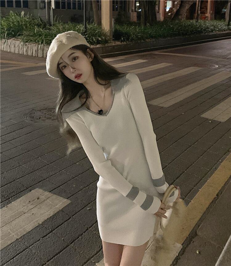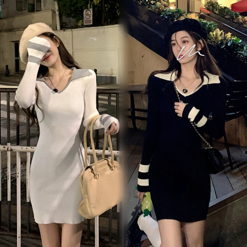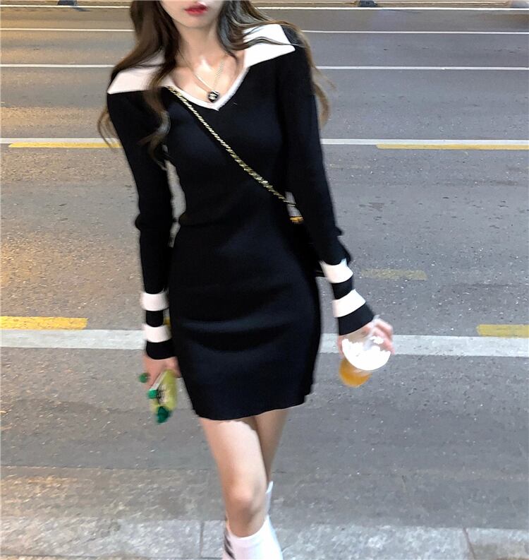 レディース ワンピース ニットワンピ セータードレス ミニ 長袖 Vネック 襟付き 角襟 スリム ボディコンシャス スレンダー リブニット ストレッチ 伸縮性 かわいい きれいめ シンプル 上品 おしゃれ エキゾチック こなれ感 ガーリー エレガント モダン 抜け感 ラブリー キュート 都会的 アメリカン セクシー 色気 シック 可愛い センシュアル 春 秋 デート お出かけ 休日 クラブ 韓国 楽ちん プチプラ 普段使い モテ トレンド フリーサイズ 白 ホワイト 黒 ブラック バイカラー モノトーン