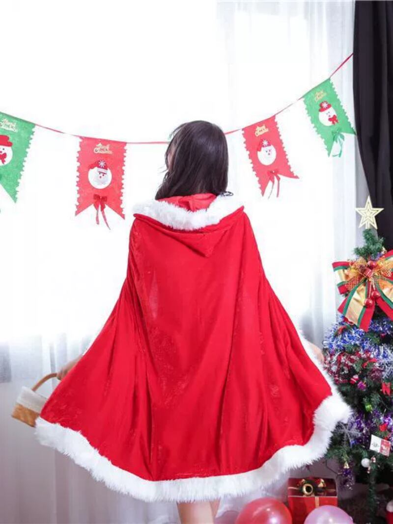 華やかなレッドに優しいホワイトのふわふわ素材を添えて、まるで物語の中のヒロイン。レトロ感漂うケープデザインは、写真映えも抜群!クリスマスパーティーや冬のイベントで、心ときめくひと時を演出します。