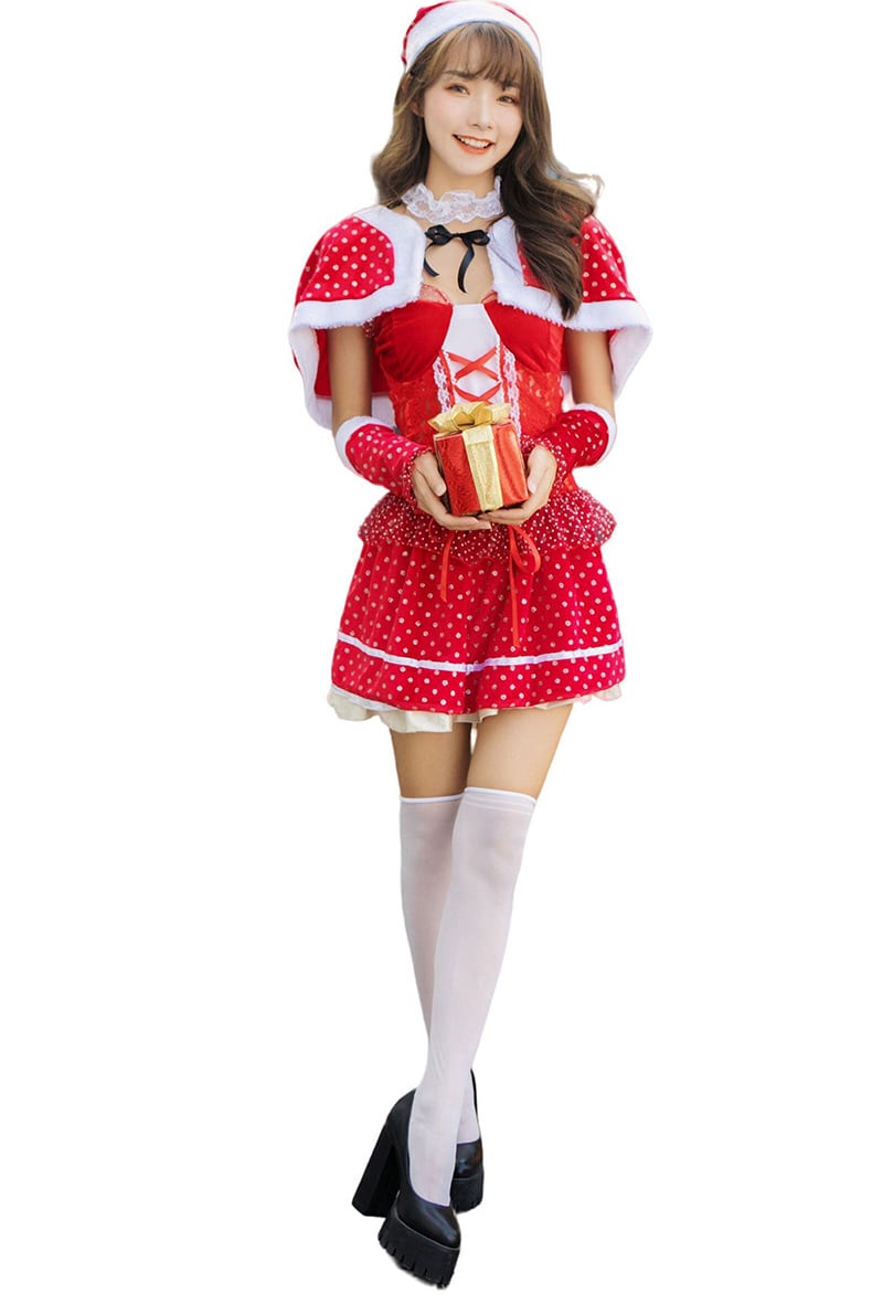 フリルを贅沢にあしらったミニ丈ドレスに、レースアップが目を引くコルセット風デザイン。レースのチョーカー、アームドレス、ケープ、帽子まで揃った豪華な5点セットが、“かわいさ”と“セクシーさ”の絶妙なバランスを叶えます。 ガーリーでラブリーな雰囲気に、冬らしいドット柄をプラスして、クリスマスパーティーの視線をひとりじめ!