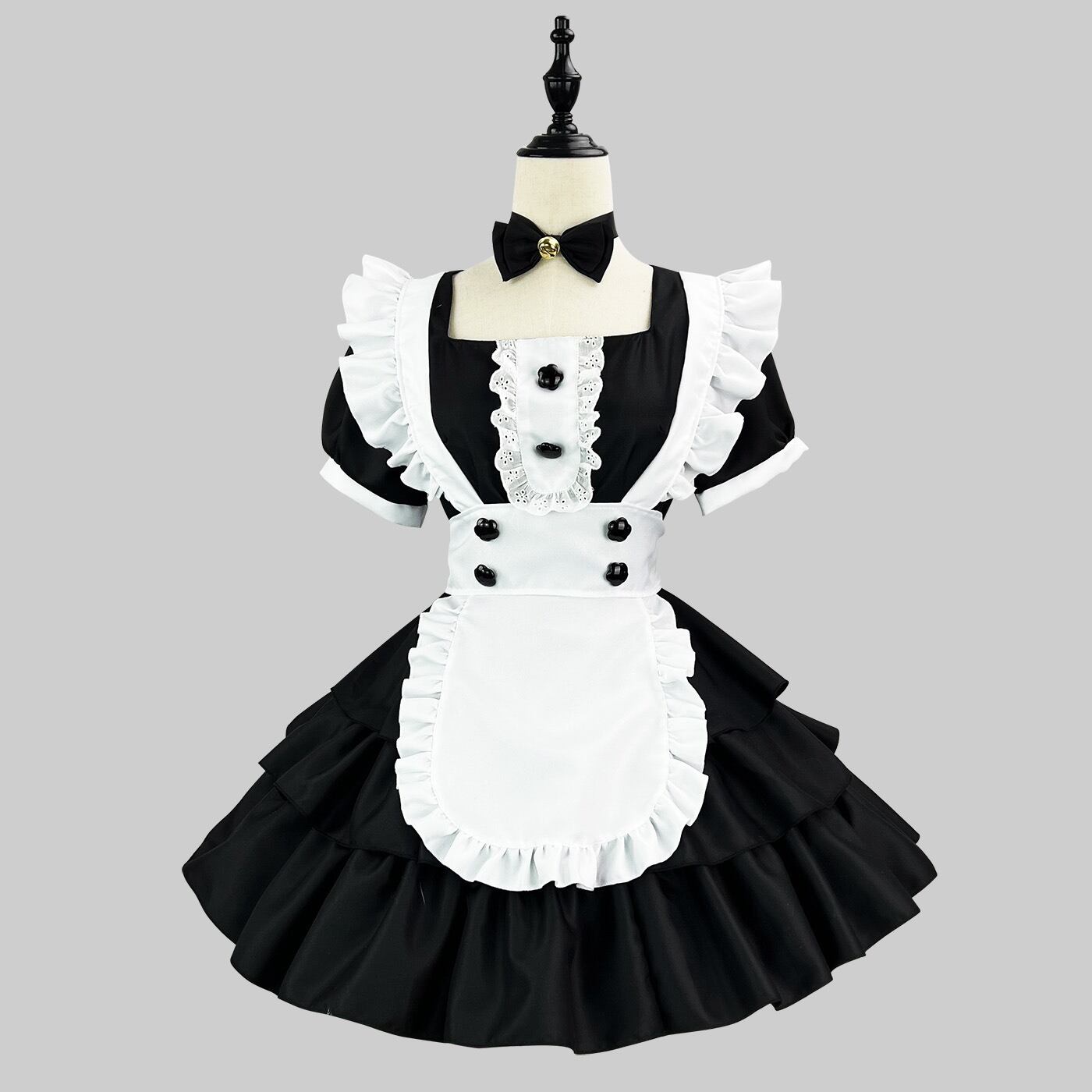 大人可愛いデザインのメイド服。ショート丈とAラインシルエットが特徴で、膝上のフリルが可愛らしさを引き立てます。ウエストマークデザインにより、女性らしいラインを強調しつつ、体型カバーにも優れています。上品でありながらもクールな印象を与えるので、様々なイベントやパーティー、コスプレにも最適です。春夏秋冬、オールシーズンで着用可能なシーズンレスな一着です。