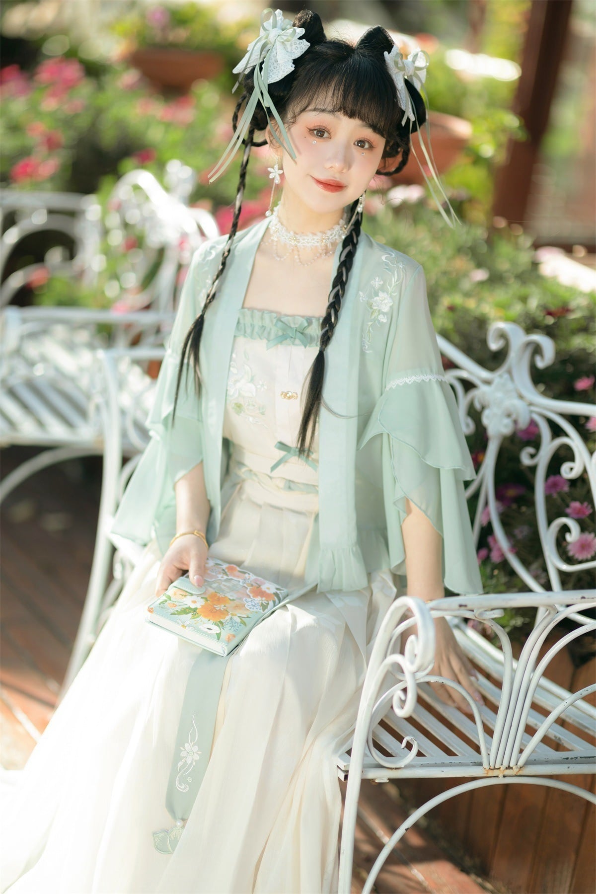 華やかで存在感のあるこのスリーピースは、イベントやパーティーにぴったりの一着です。透け感のあるデザインとフリル、刺繍が施されたアウターは、大人可愛いスタイルを演出します。スカート部分のフレアシルエットが脚を美しく見せ、自然な動きで魅了します。