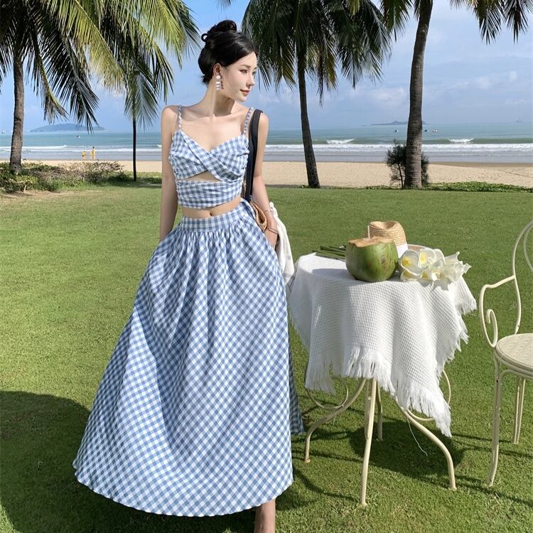 上品でかわいらしいツーピース、フロントクロスキャミソールとフレアロングスカートのセットです!肌見せデザインがセクシーさを演出しつつ、シンプルなフレアスカートが優雅さを添えます。レトロなギンガムチェックパターンは、季節感をしっかり表現し大人可愛い装いをお楽しみいただけます。